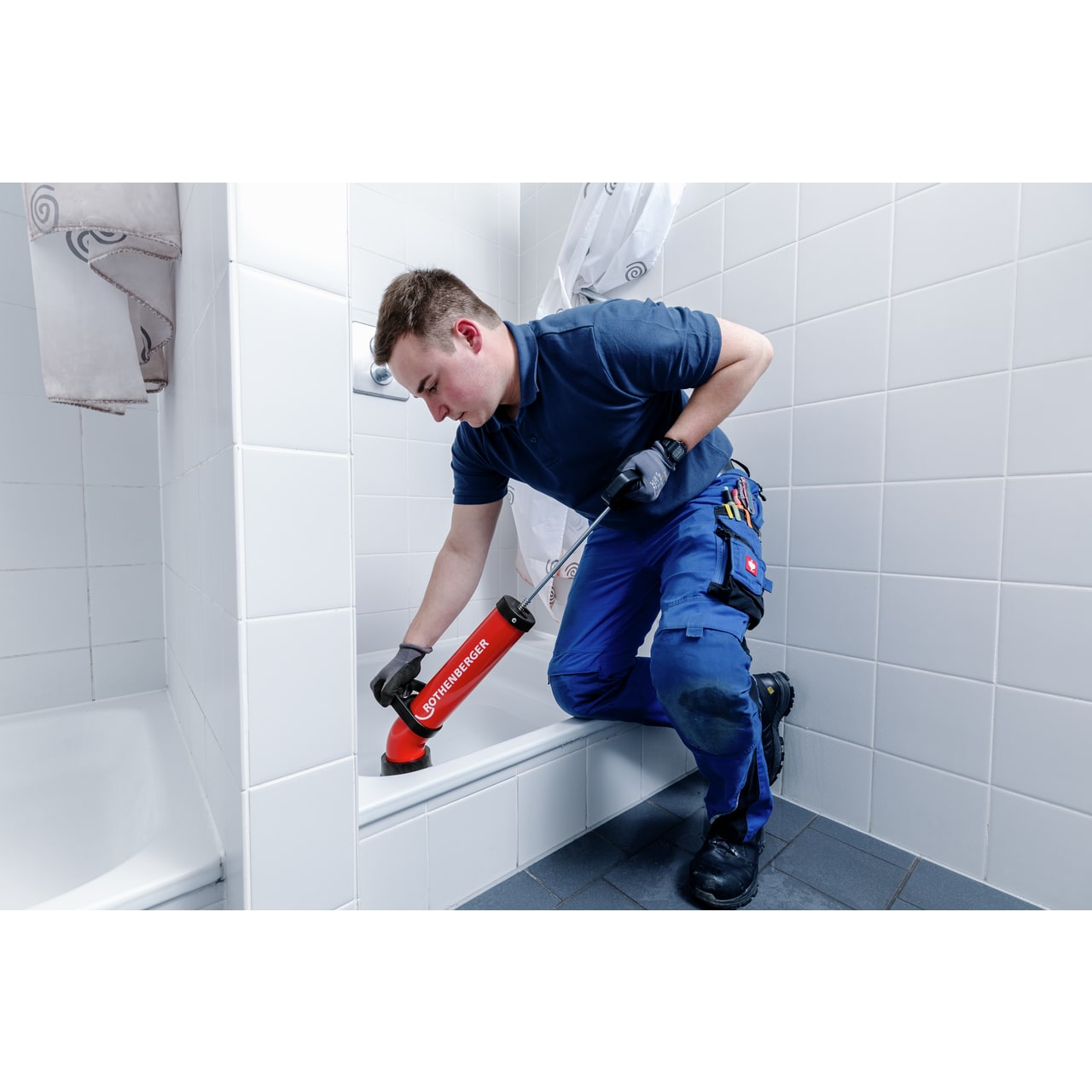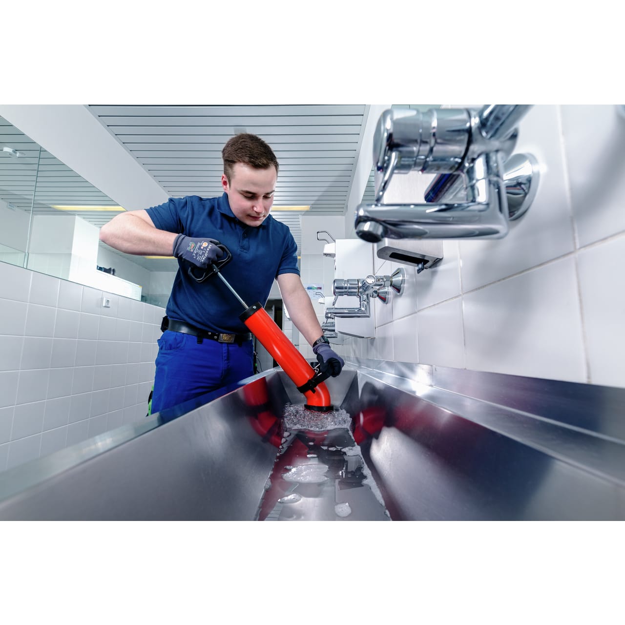Optymalne narzędzie dla początkujących instalatorów, dozorców i osób czyszczących odpływy do szybkiego usuwania prostych zatorów w rurach łączących umywalki i zlewozmywaki, wanny i toalety na zasadzie ssania / ciśnienia.