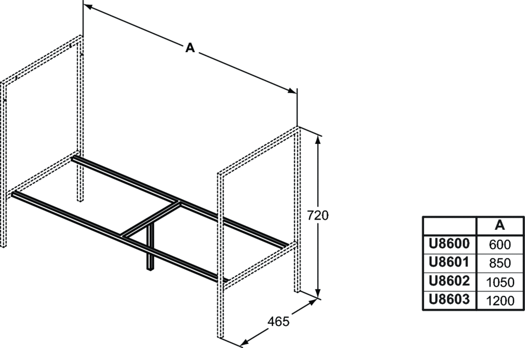 Półka ramy nośnej 105 cm do montażu stojącego, do łączenia z nogami ramy nośnej. Zestaw montażowy w komplecie. Przeznaczone do kompletowania z nogami ramy nośnej do montażu stojącego z konsolą pod umywalkę i blatem.