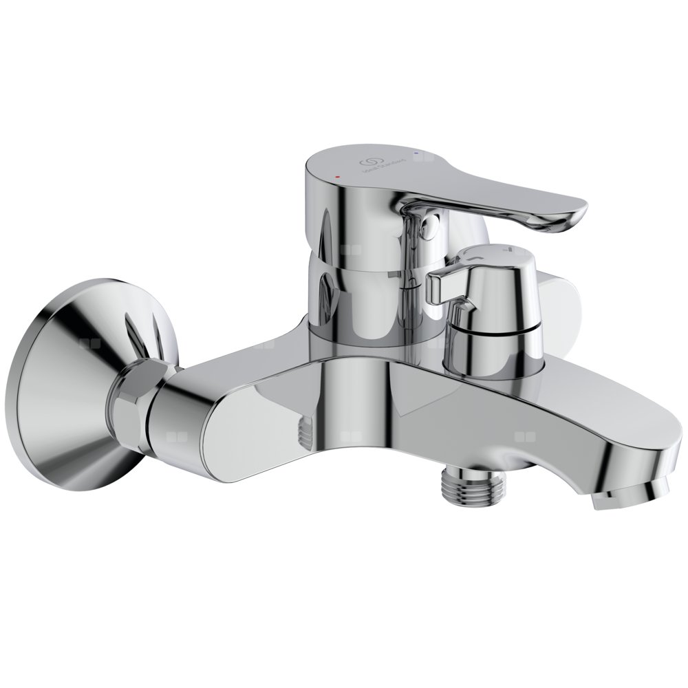 Głowica ceramiczna 35 mm z ogranicznikiem temperatury. Metalowy uchwyt z nadrukowanymi czerwonymi i niebieskimi oznaczeniami. Zawór zwrotny. Przyłącza mimośrodowe. Aerator (perlator). Ceramiczny przełącznik manualny wanna/natrysk. Zgodność z normą EN817.