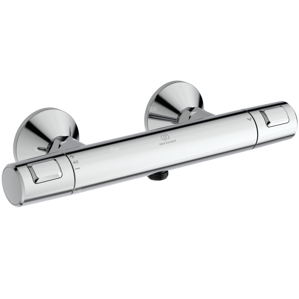 Bateria termostatyczna natryskowa naścienna Ceratherm T25. Standardowe przyłącza mimośrodowe. Głowica termostatyczna IS nowej technologii. Ceramiczny zawór G1/2 180°. Bez akcesoriów w komplecie. Uchwyt z ogranicznikiem temperatury do 40°C i przyciskiem redukującym wypływ o 50%. Zawór zwrotny. Zalecane dodatkowe elementy: nakładana półka do baterii termostatycznych Ceratherm T25, T50 i T100 A7215AA.