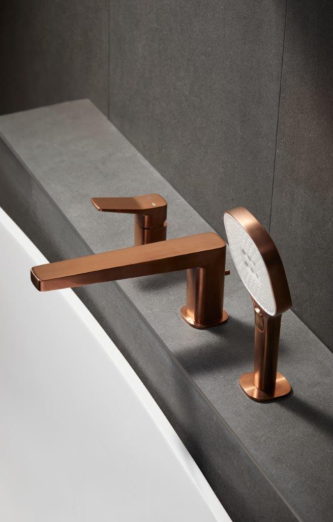 Bateria Malaga, wannowa, 3-otworowa stojąca, PVD brushed rose gold