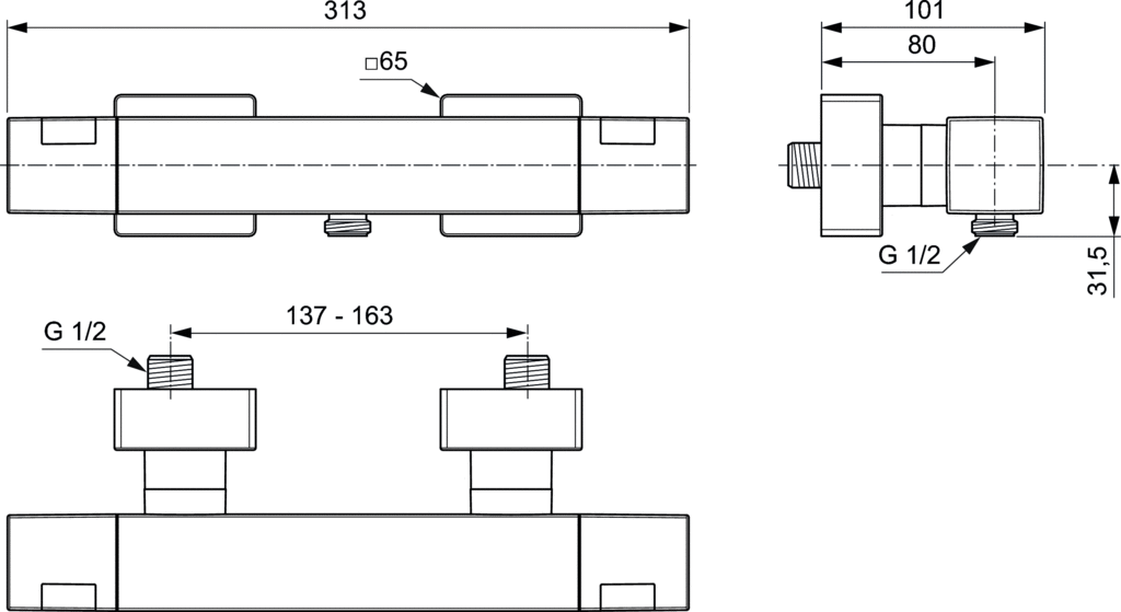 Bateria termostatyczna natryskowa naścienna Ceratherm C100. Zawór zwrotny. Głowica termostatyczna ECO z przyciskiem redukującym przepływ wody o 50%. Funkcja Cool body zapobiegająca poparzeniu przez korpus baterii. Ukryte przyłącza mimośrodowe (regulowane 137 mm - 163 mm). Funkcja Alti-Kalk. Zintegrowany ogranicznik temperatury. Lewy uchwyt sterujący do ustawiania temperatury wody, prawy do regulacji przepływu.