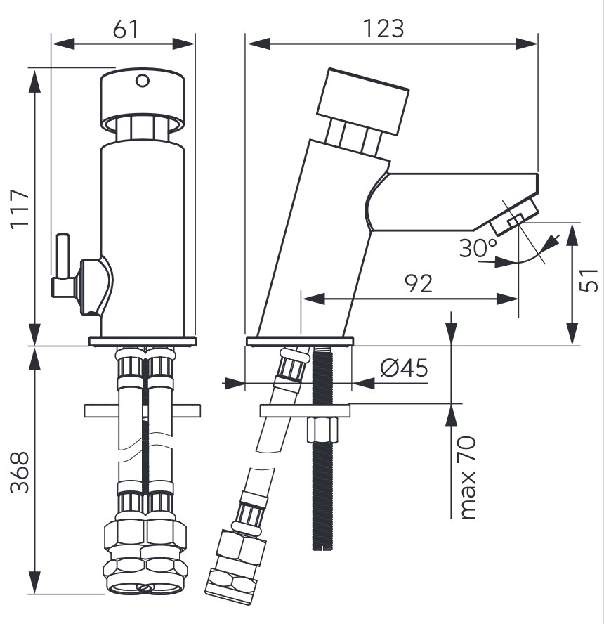 Bateria czasowa o uniwersalnym, cylindrycznym kształcie. Obły kształt korpusu i wylewki ułatwi utrzymanie baterii w czystości, krople wody nie będą osiadać, pozostawiając przy tym mniej osadu wapiennego. Bateria posiada funkcje regulacji czasu wypływu wody, co pomoże użytkownikowi zredukować zużycie wody a zarazem koszty wody i energii.