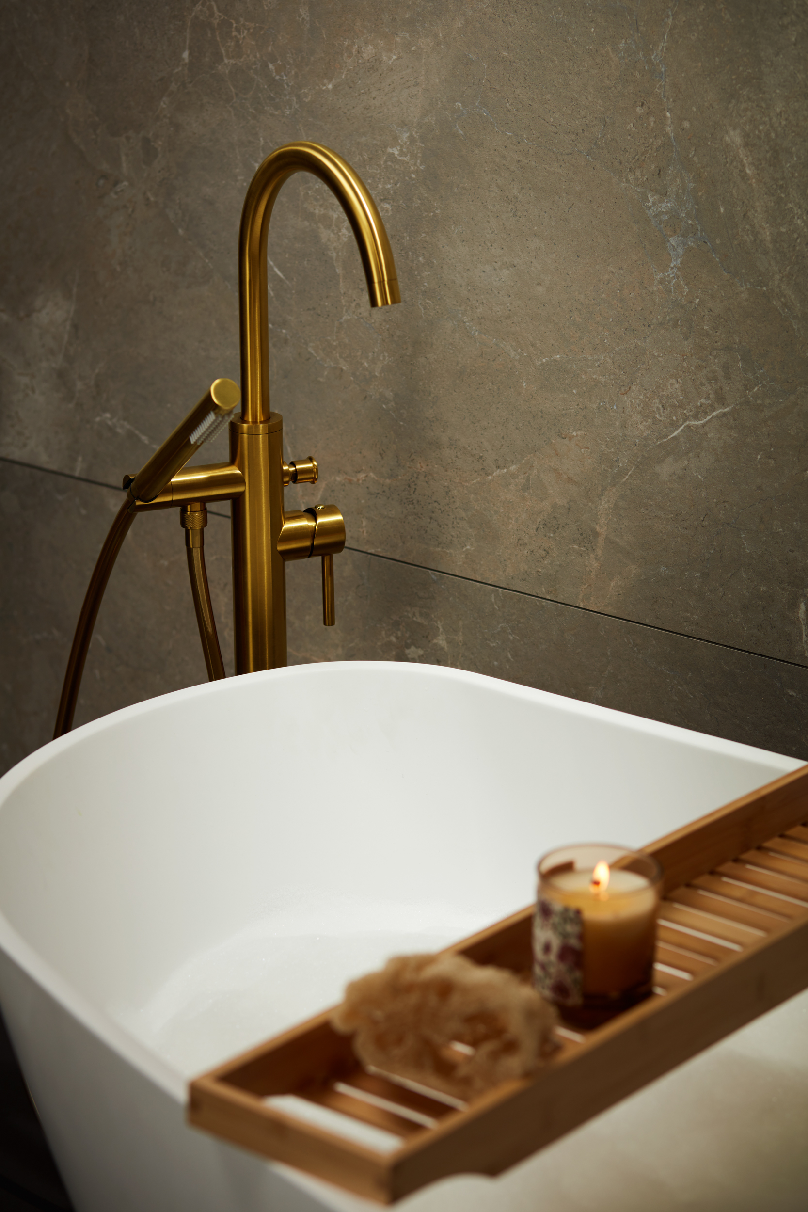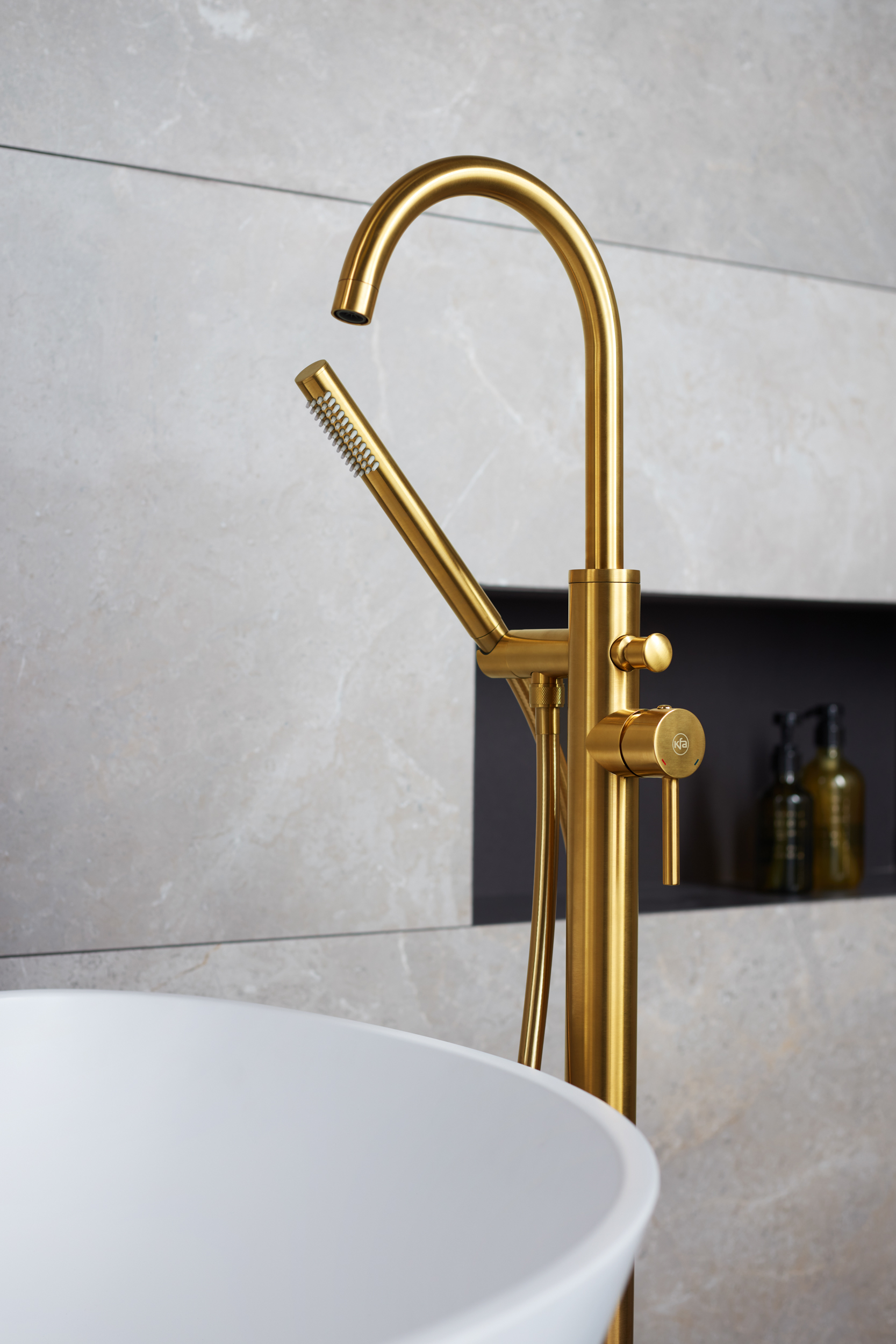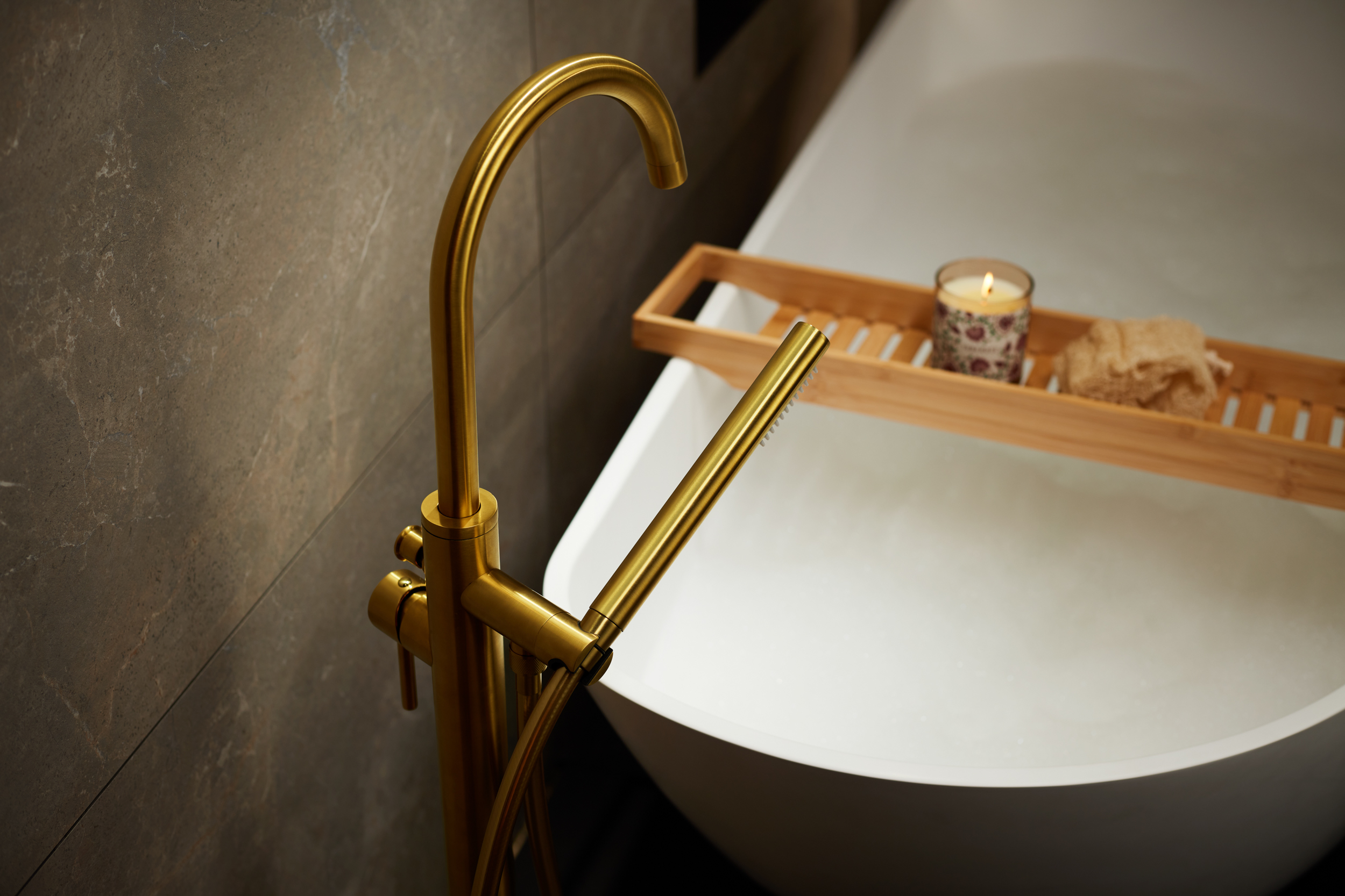 Bateria wannowa stojąca KFA Armatura MOZA, kolor złoty, montaż podłoga