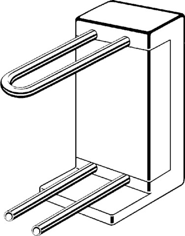 Blok przyłączeniowy do grzejnika. Przeznaczenie: przyłącze grzejnikowe ze ściany, montaż grzejnika po zakończeniu wszystkich prac związanych z tynkowaniem, układaniem płytek, wykonywaniem jastrychu i malowaniem. Wyposażenie: Skrzynka izolacyjna, rura ze stali nierdzewnej d15, nr wzoru 1097.6, nr kat. 379 698, d: 15 H: 255