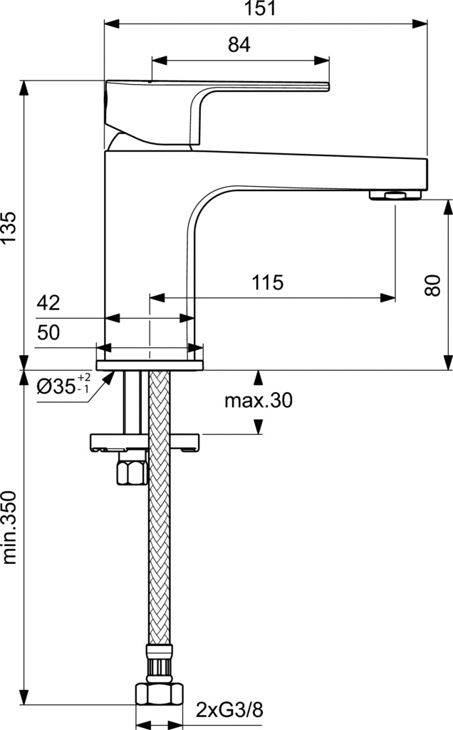 Głowica ceramiczna 28 mm z ogranicznikiem temperatury wody. Metalowy uchwyt z oznaczeniem wody ciepłej i zimnej. Aerator typu Perlator z ogranicznikiem przepływu wody do 5 l/min. Wysokość od przepływ wodyu wody do podstawy baterii H80. System montażu EASY-FIX. Wężyki przyłączeniowe G3/8". Zgodność z EN817.