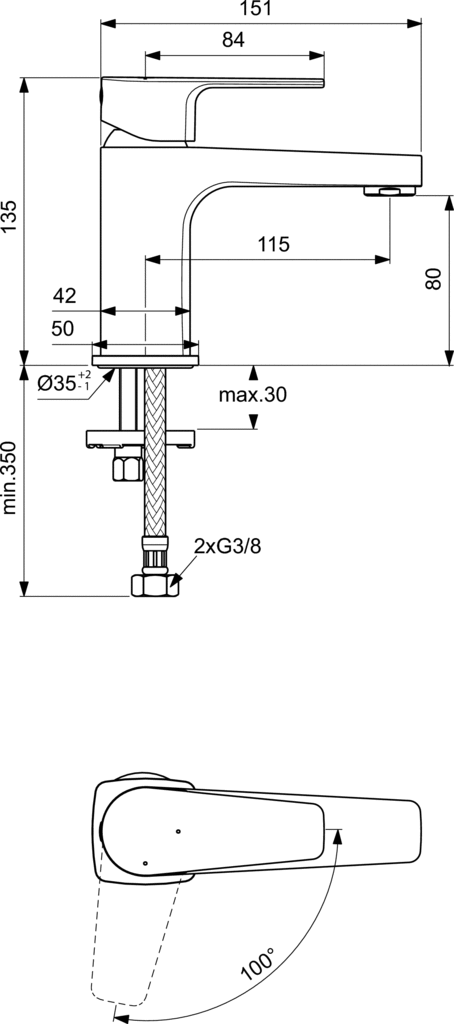 Głowica ceramiczna 28 mm z ogranicznikiem temperatury wody. Metalowy uchwyt z oznaczeniem wody ciepłej i zimnej. Aerator typu Perlator z ogranicznikiem przepływu wody do 5 l/min. Technologia BlueStart® - uchwyt na wprost - przepływ wody wody zimnej. Wysokość od przepływ wodyu wody do podstawy baterii H80. System montażu EASY-FIX. Wężyki przyłączeniowe G3/8". Zgodność z EN817.