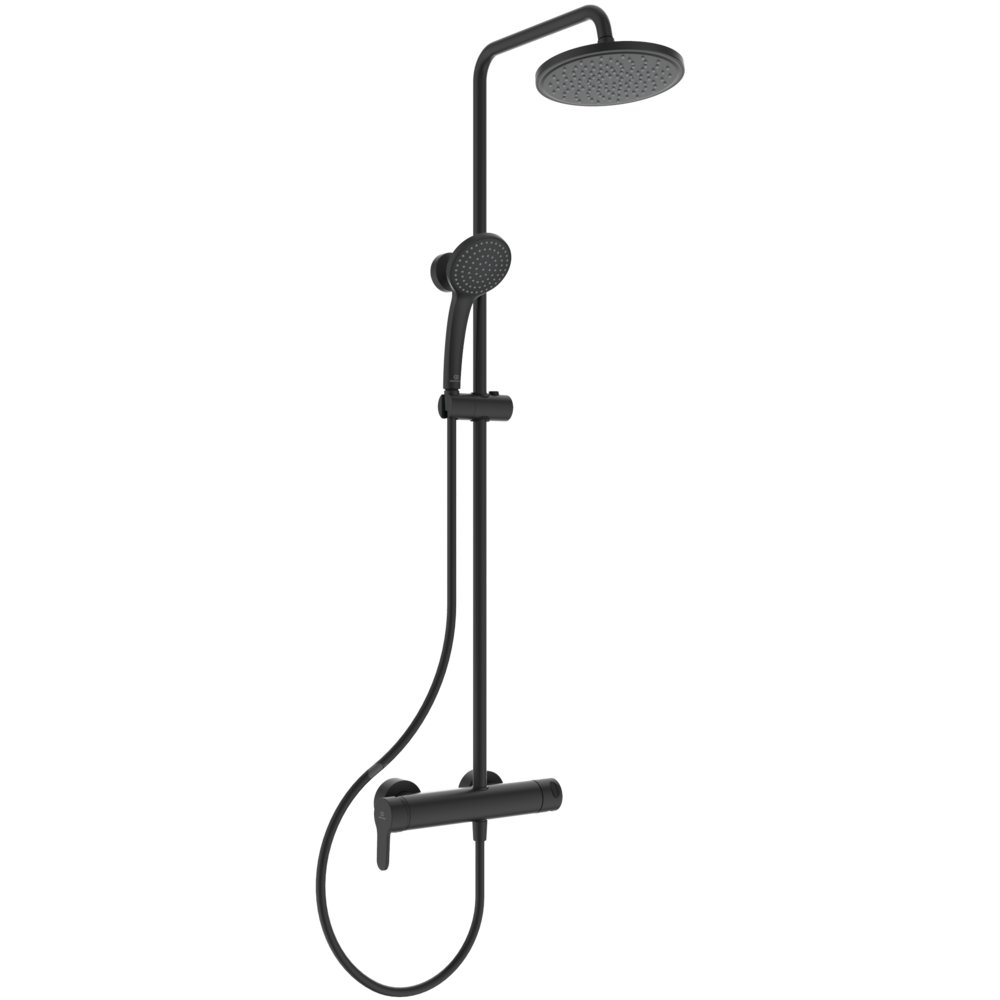 Jednouchwytowy system prysznicowy natynkowy ze zintegrowanym przełącznikiem. Innowacyjna głowica ceramiczna FirmaFlow 38 mm z ogranicznikiem temperatury. Mocowanie z maskującymi nakrętkami. Przyłącza mimośrodowe z redukcją hałasu. Metalowy uchwyt z oznaczeniem: ciepła/zimna woda. Zawór zwrotny. Zintegrowany dwukierunkowy przełącznik, rotacja: 360. Deszczownica z tworzywa, Ø 200 mm, z ogranicznikiem przepływu. wody 12 l/min. Jednofunkcyjna słuchawka prysznicowa, Ø 100 mm,. z ogranicznikiem przepływu wody 8 l/min. Wąż natryskowy, 1750 mm.