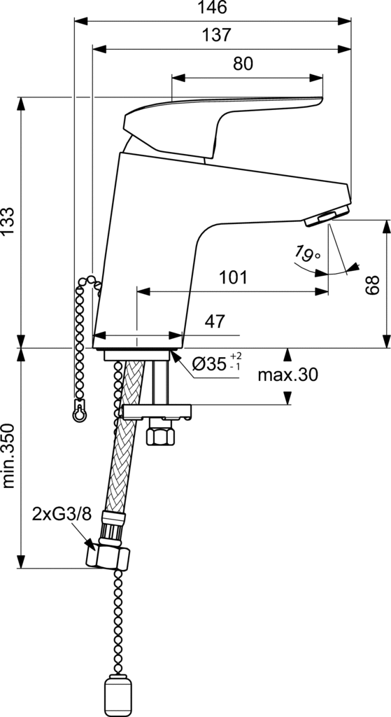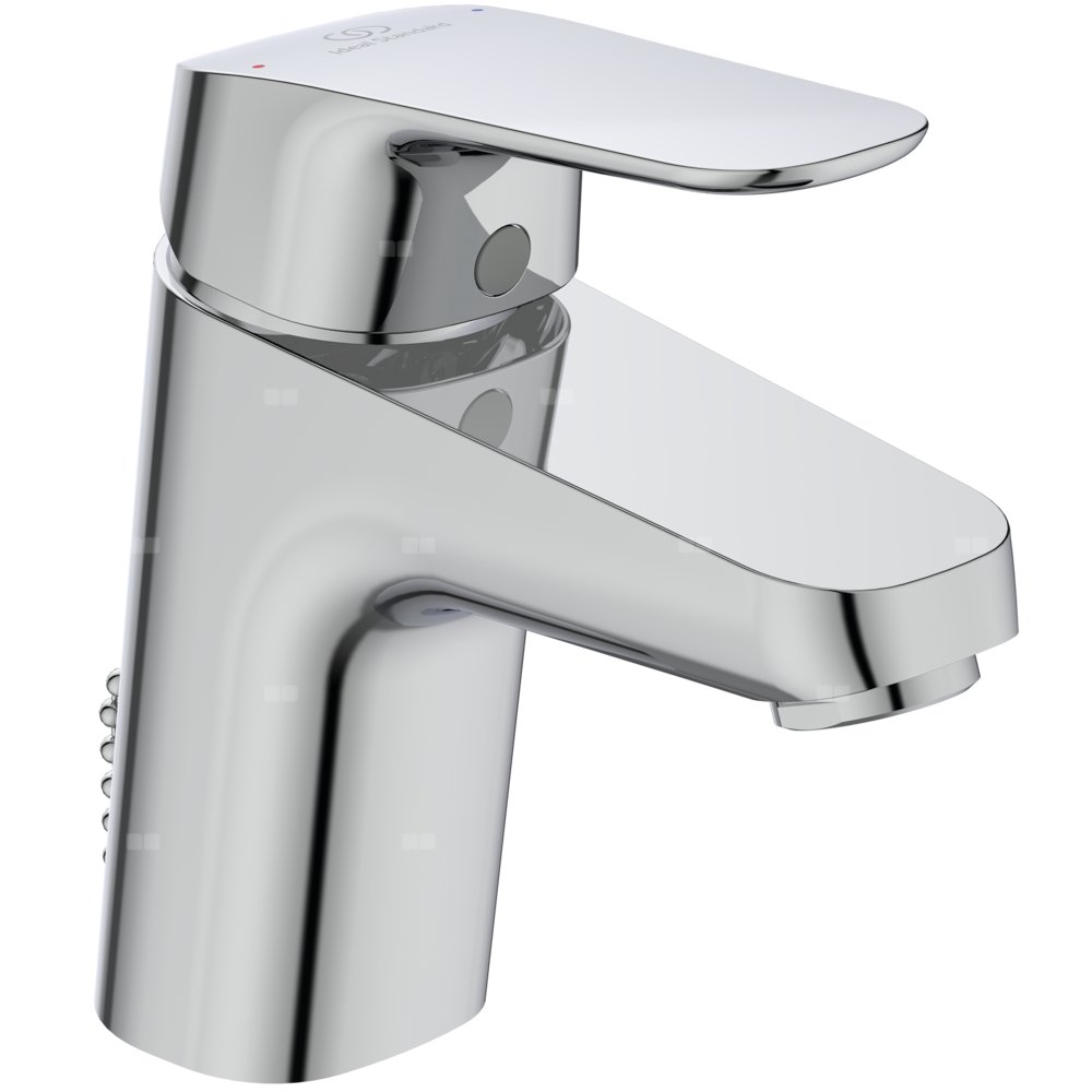 Bateria umywalkowa stojąca. Innowacyjna ceramiczna głowica FirmaFlow 38 mm, z funkcją. ograniczenia temperatury wody. Metalowy korpus. Metalowy uchwyt z oznaczeniem wody: ciepła/zimna. Smukły aerator (perlator) z ogranicznikiem przepływu wody. do 5 l/min. Łańcuszkiem z gumową nasadką na korek. Wężyki przyłączeniowe G3/8”. System montażu Easy-Fix. Zgodność z EN817.