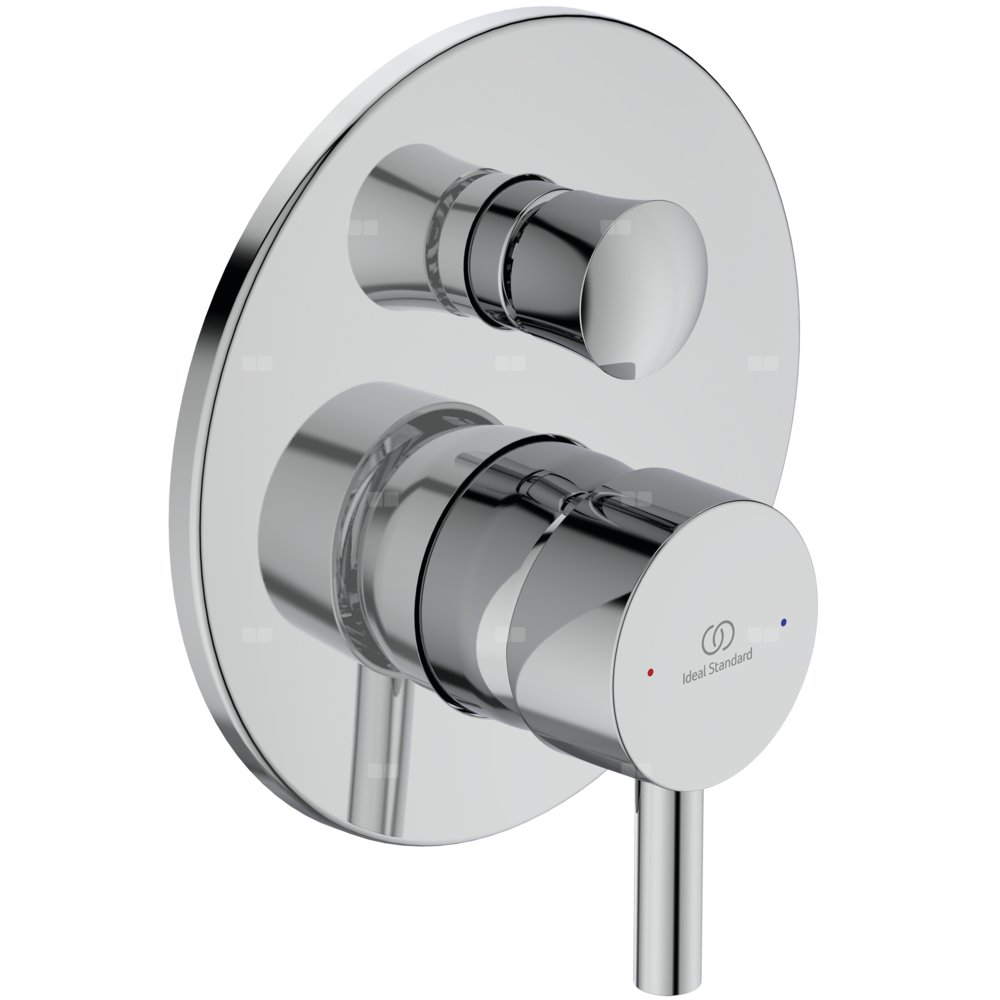 Zestaw montażowy baterii podtynkowej wannowo-natryskowej Ceraline. Głowica ceramiczna IS 47 mm CLICK. Metalowy uchwyt z nadrukowanymi czerwonymi i niebieskimi oznaczeniami. Okrągła rozeta. Automatyczny przełącznik. Do skompletowania z uniwersalnym zestawem podtynkowym EASY-BOX A1000NU.