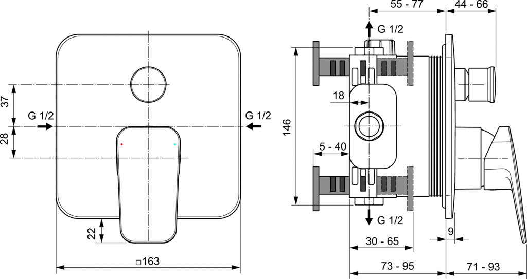 Głowica, 47 mm, z ograniczeniem temperatury wody. Przełącznik automatyczny wanna/natrysk. Metalowy uchwyt z oznaczeniem wody: ciepła/zimna. Rozeta maskująca z tworzywa, chromowana. Do skompletowania z uniwersalnym zestawem Easy Box - A1000NU.