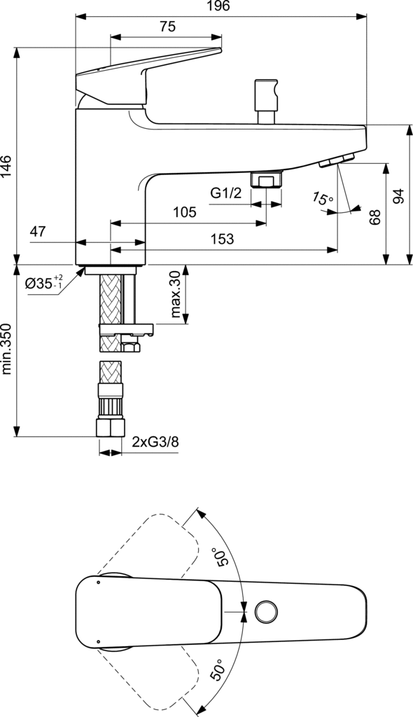Innowacyjna ceramiczna głowica FirmaFlow®, 38 mm, z funkcją. ograniczenia temperatury wody. Metalowy uchwyt z oznaczeniem wody: ciepła/zimna. Przełącznik automatyczny wanna/natrysk. Zawór zwrotny. System montażu Easy-Fix. Wężyki przyłączeniowe G3/8”.