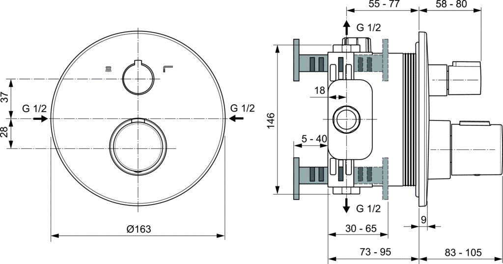 Zestaw montażowy baterii termostatycznej wannowo-natryskowej podtynkowej (część zewnętrzna). Z głowicą termostatyczną IS (nowa technologia). Dwudrożny ceramiczny zawór talerzowy włącz/wyłącz 90° ze zintegrowanym przełącznikiem. Bez akcesoriów w komplecie. Niezbędne wyposażenie: zestaw montażowy A1000NU (część wewnętrzna).