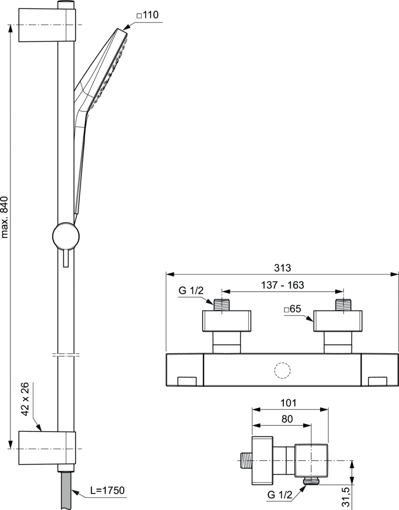 Zestaw natryskowy z baterią termostatyczną Ceratherm C100, drążkiem 900 mm oraz 3 - fukncyjną słuchawką natryskową Evo Diamond. Zawór zwrotny. Głowica termostatyczna ECO z przyciskiem redukującym przepływ wody o 50%. Funkcja Cool body zapobiegająca poparzeniu przez korpus baterii. Ukryte przyłącza mimośrodowe (regulowane 137 mm - 163 mm). Funkcja Alti-Kalk. W zestawie z wężem natryskowym IdealFlex 1750mm i ukrytym przyłączem G1/2".