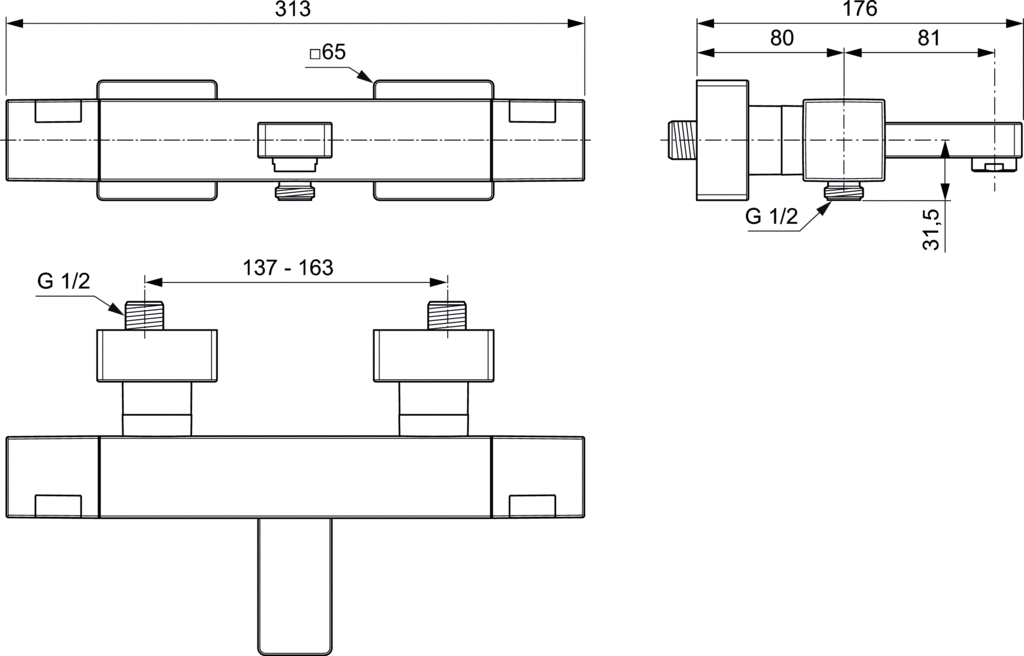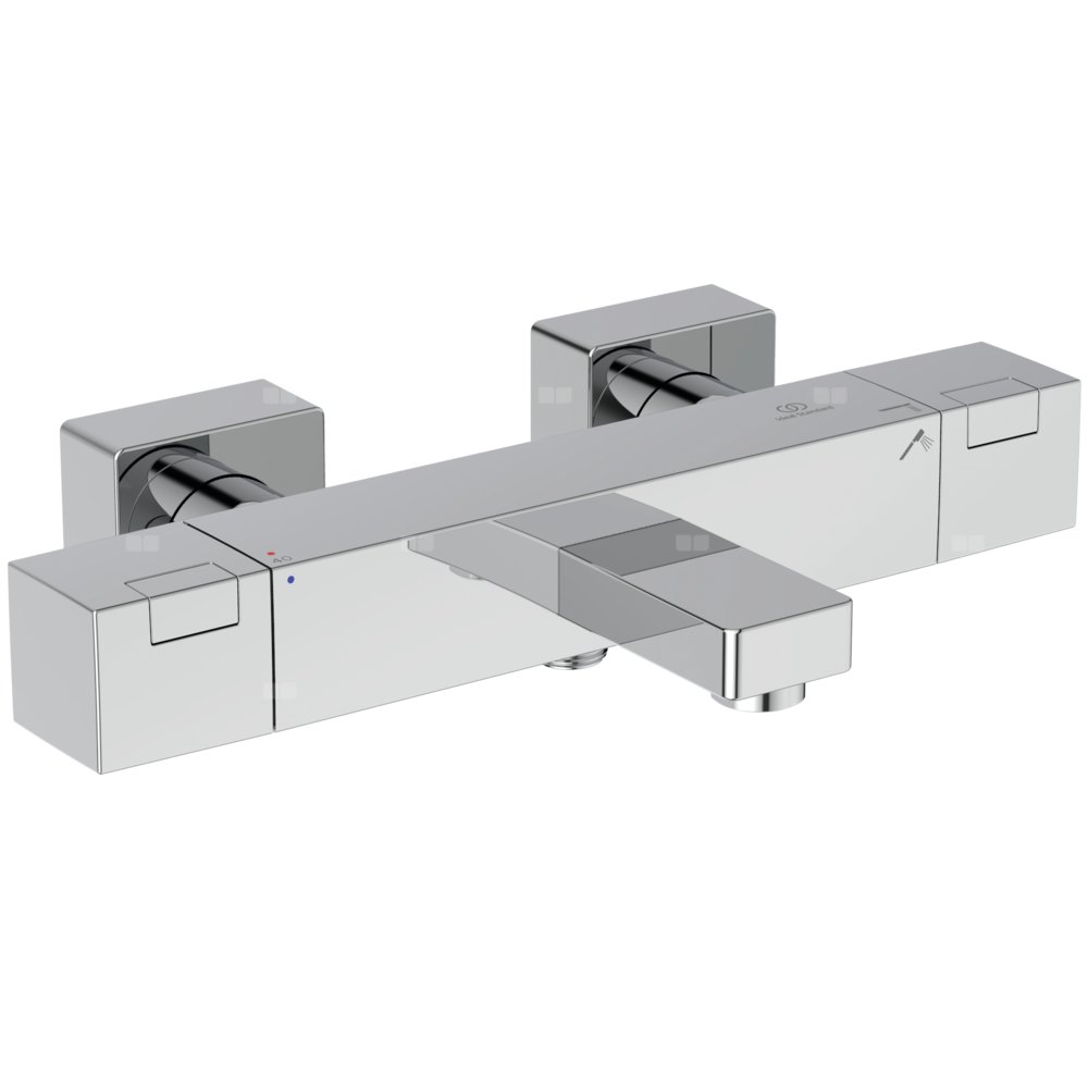 Bateria termostatyczna wannowo-natryskowa Ceratherm C100 z zaworem zwrotnym i odpływem 176 mm. Głowica termostatyczna ECO ze zintegrowanym ogranicznikiem temperatury i przyciskiem redukującym przepływ wody o 50%. Funkcja Cool body zapobiegająca poparzeniu przez korpus baterii. Ukryte przyłącza mimośrodowe. Funkcja Alti-Kalk. Aerator M24 x 1. Metalowe uchwyty ze zintegrowanym przełącznikiem. Zgodność z normą EN1111.