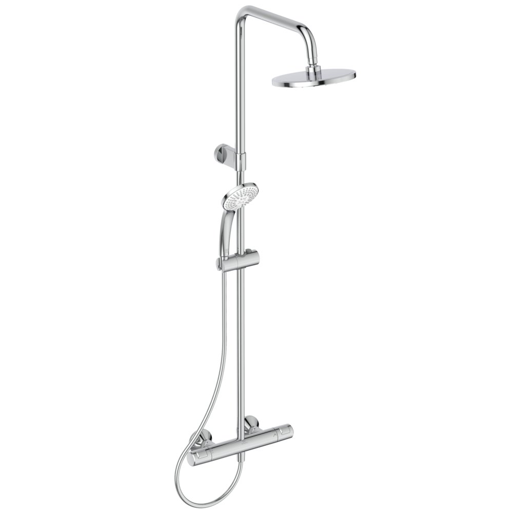 Zestaw natryskowy z baterią termostatyczną wannowo-natryskową ścienną Ceratherm T25. Przyłącza mimośrodowe. Głowica termostatyczna IS. Ceramiczny zawór talerzowy włącz/wyłącz 180°. Zintegrowany przełącznik w uchwycie. Manualny przełacznik bateria/wanna. Uchwyt z ogranicznikiem temperatury do 40°C i przyciskiem redukującym przepływ wody o 50%. Funkcja Cool Body, zapobiegająca ryzyku poparzenia przez nagrzany korpus baterii. Zawór zwrotny. Zgodność z normą EN1111. W zestawie: Plastikowa deszczownica Ø 200mm, z ogranicznikiem przepływu wody do 12 l/min. Trójfunkcyjna słuchawka prysznicowa Idealrain 100 mm, z ogranicznikiem przepływu wody do 8 l/min. Wąż natryskowy Idealflex, 1600 mm. Pozioma rura z funkcją teleskopową do 100 mm (regulacja możliwa tylko podczas montażu).