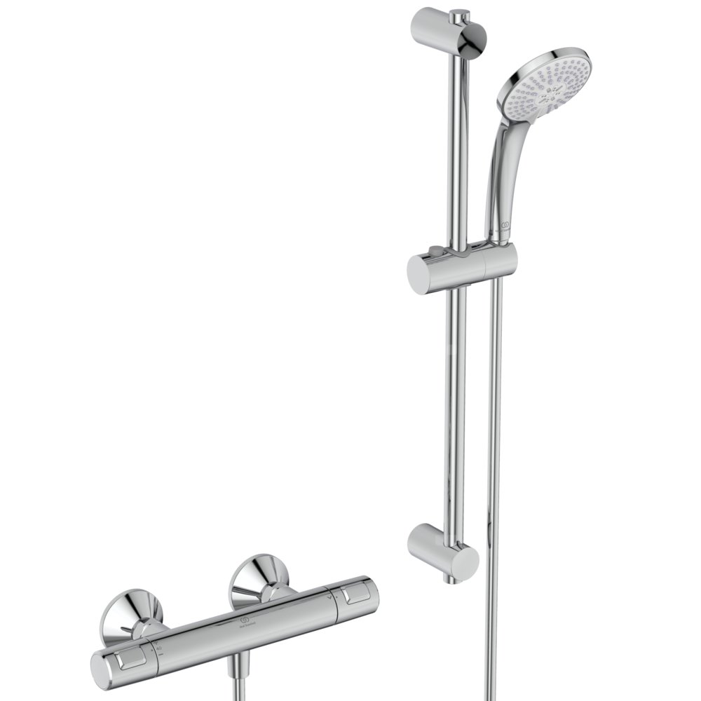 Bateria termostatyczna natryskowa naścienna Ceratherm T25. Standardowe przyłącza mimośrodowe. Głowica termostatyczna IS nowej technologii. Ceramiczny zawór G1/2 180°. Bez akcesoriów w komplecie. Uchwyt z ogranicznikiem temperatury do 40°C i przyciskiem redukującym wypływ o 50%. Zawór zwrotny. W komplecie zestaw natryskowy: słuchawka natryskowa 100 mm 3-funkcyjna Idealrain, z ogranicznikiem przepływu 8l/min oraz wąż natryskowy 1250 mm Idealflex i drążek natryskowy 600 mm z regulacją punktów mocowania do ściany. Zalecane dodatkowe elementy: nakładana półka do baterii termostatycznych Ceratherm T25, T50 i T100 A7215AA.