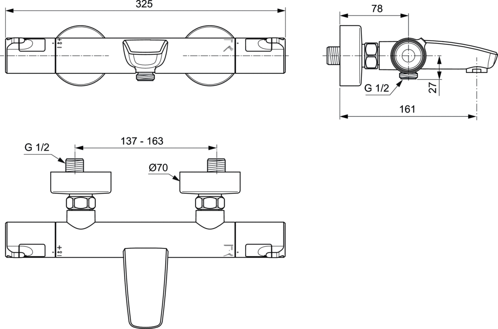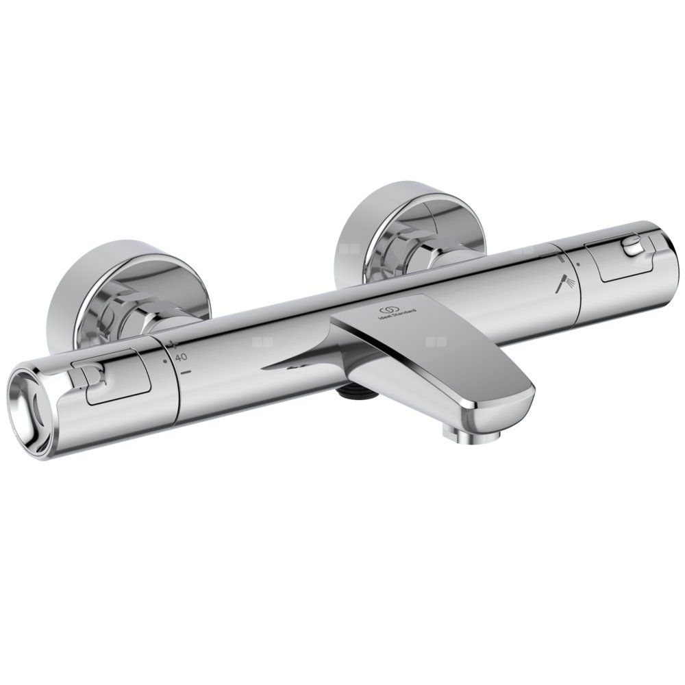 Bateria termostatyczna wannowa naścienna Ceratherm T50 z akcesoriami. Standardowe przyłącza mimośrodowe. Głowica termostatyczna IS nowej technologii. Ceramiczny zawór G1/2 180°. Uchwyt z ogranicznikiem temperatury do 40°C i przyciskiem redukującym przepływ wody o 50%. Zawór zwrotny. System natryskowy w komplecie: słuchawka natryskowa 110 mm 3-funkcyjna Idealrain Evo Round, z ogranicznikiem przepływu 8l/min oraz wąż natryskowy 1750 mm Idealflex i drążek natryskowy 600 mm z regulacją punktów mocowania do ściany. Zalecane dodatkowe elementy: nakładana półka do baterii termostatycznych Ceratherm T25, T50 i T100 A7215AA.