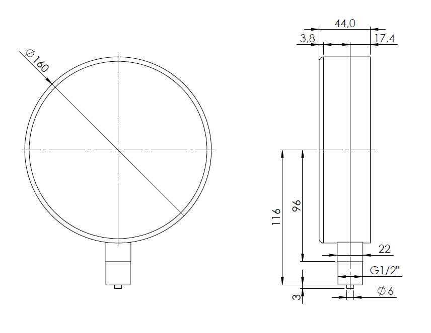 Ciśnieniomierz różnicowy AFRISO KP D401 0/160 mbar mosiądz G1/2B radialne fi 160, kl. 1.6%