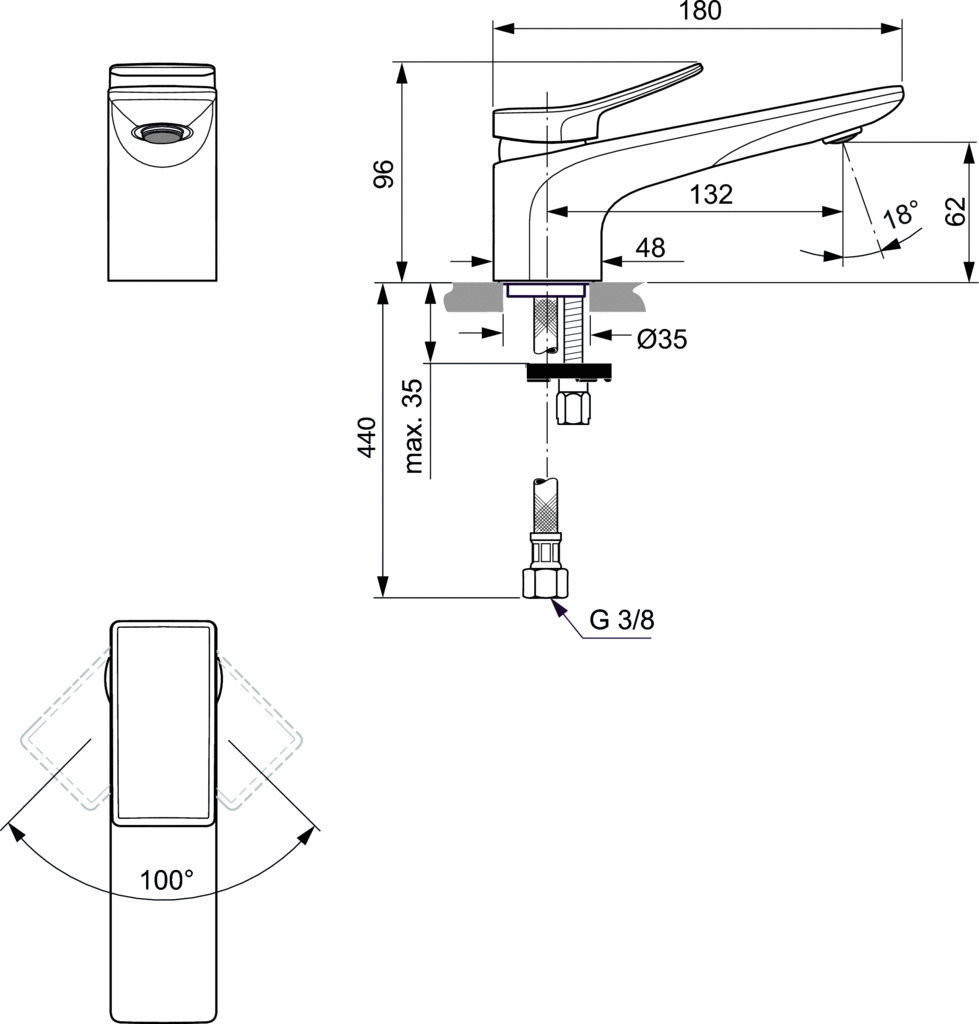 Głowica ceramiczna 28 mm z ogranicznikiem temperatury wody. Logo Ideal Standard umieszczone na korpusie baterii. Metalowy uchwyt bez oznaczeń. Aerator M24x1 z ogranicznikiem przepływu wody do 5 l/min. System montażu EASY-FIX. Wężyki przyłączeniowe G3/8".