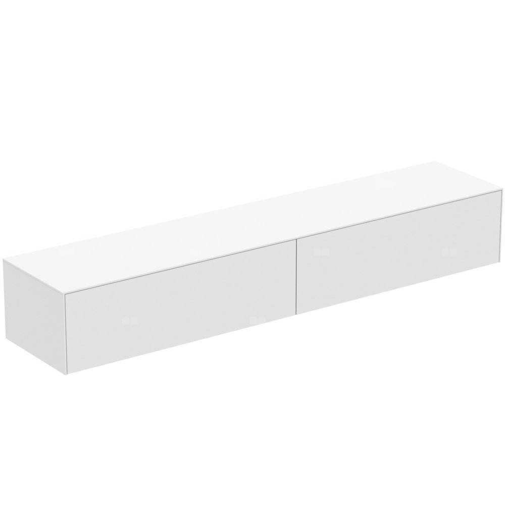 Szafka pod umywalkę bez wycięć na blacie. Do samodzielnego montażu lub do kompletowania z wiszącymi (szlifowanymi od spodu) lub nablatowymi umywalkami (z wykorzysteniem szablonów do wycięcia otworu). Z 2 szufladami z funkcjami Push to open i wolnym zamykaniem. Wykończenie wewnętrzne szafek w kolorze antracytowym.