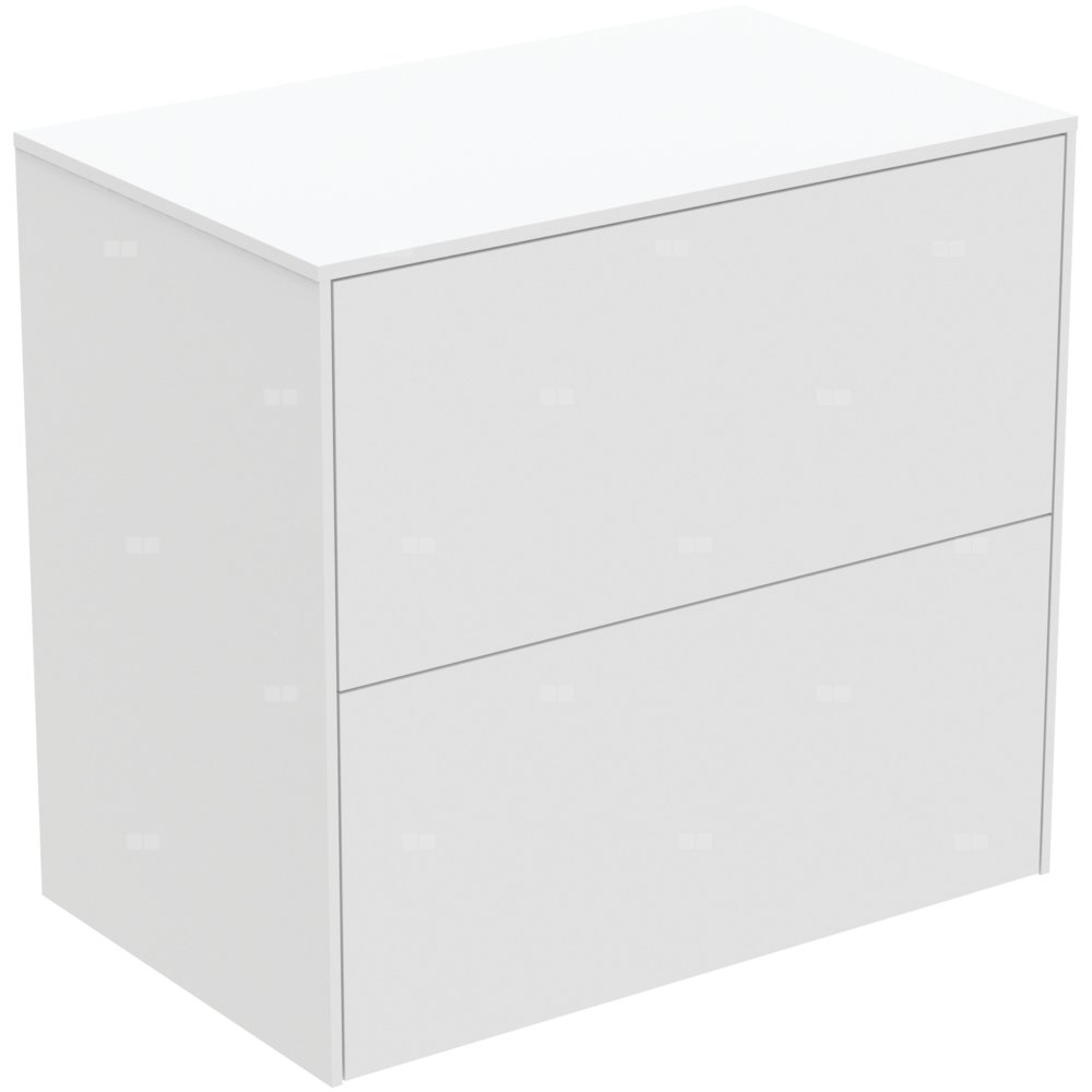 Szafka pod umywalkę bez wycięć na blacie. Do samodzielnego montażu lub do kompletowania z wiszącymi (szlifowanymi od spodu) lub nablatowymi umywalkami (z wykorzysteniem szablonów do wycięcia otworu). Z 2 zewnętrznymi szufladami z funkcjami Push to open i wolnym zamykaniem. Wykończenie wewnętrzne szafek w kolorze antracytowym.