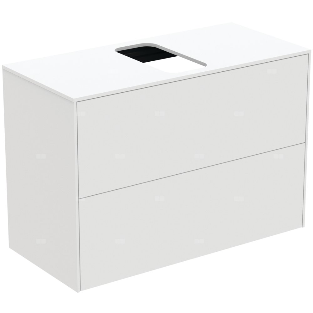 Szafka pod umywalkę z centralnie wyciętym otworem w blacie do kompletowania z umywalkami wiszącymi (szlifowanymi) lub umywalkami nablatowymi. Z 2 zewnętrznymi szufladami z funkcjami push to open i samodomykania "soft close". Wykończenie wewnętrzne szafek w kolorze antracytowym.