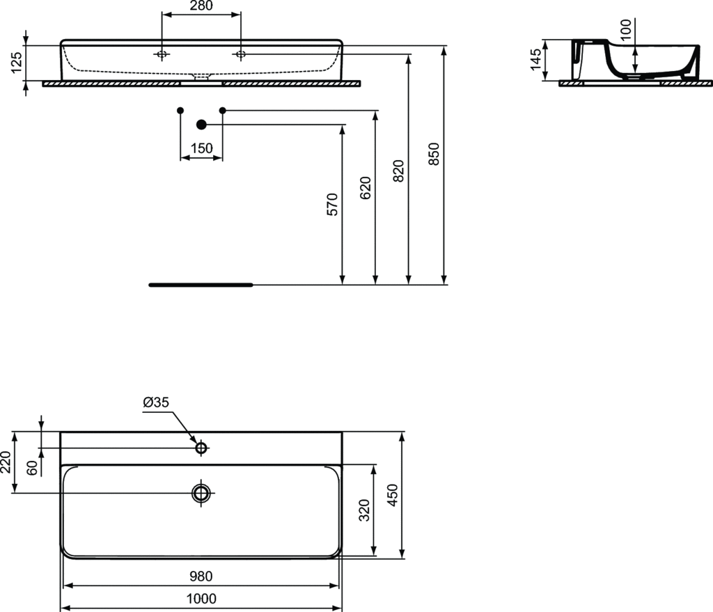Umywalka Conca mocowana do ściany z 1 wybitym otworem na baterię, bez przelewu.