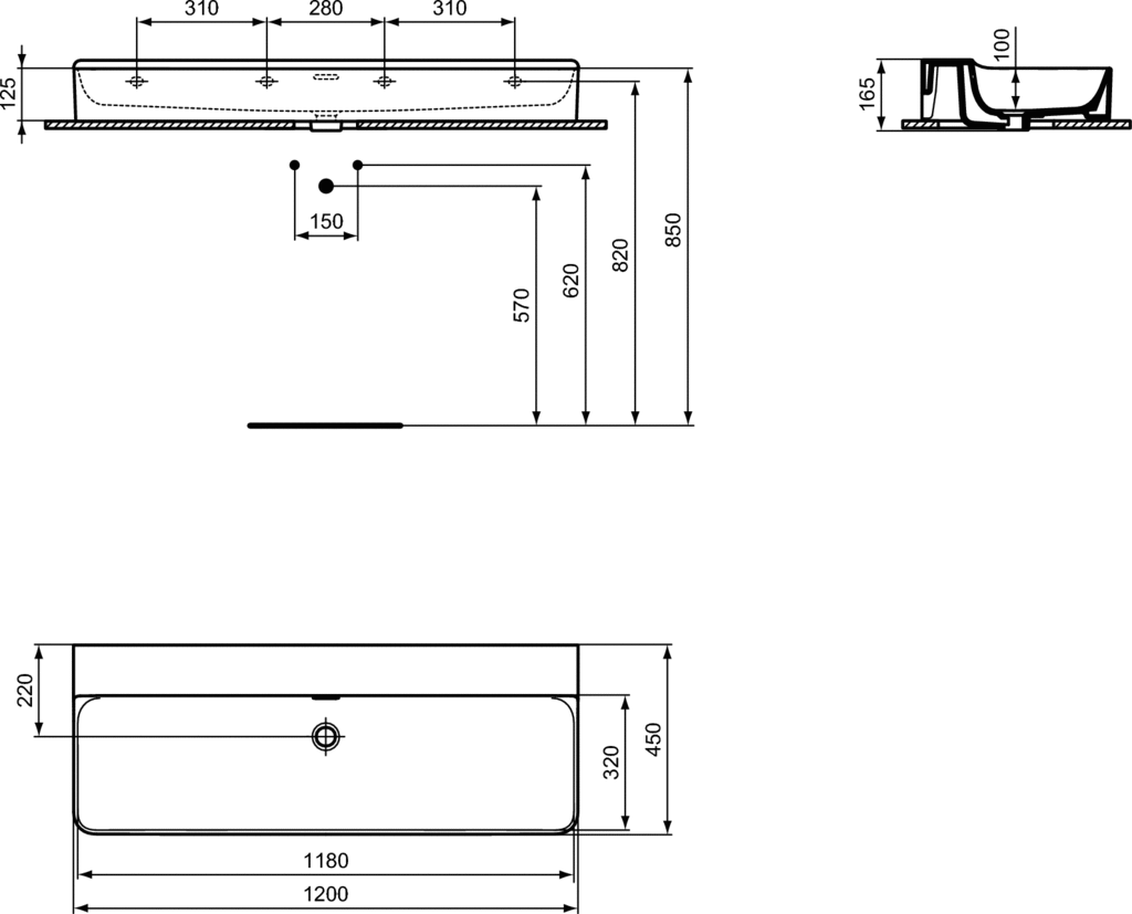 Umywalka mocowana do ściany z przelewem. Opcjonalnie: rekomendowany zestaw montażowy WW965340, dekoracyjny syfon G1 1/4 E0079AA (do montażu z/bez pólpostumentu lub podstawowej szafki), zawór kątowy odcinający A3491AA; Rozeta do syfonu G1 1/4 (do montażu z baterią bez korka automatycznego) - B4801AA.