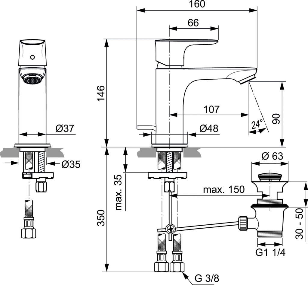 Bateria umywalkowa jednootworowa, smukły metalowy korpus 37 mm. Głowica 28 mm. Metalowy automatyczny korek. Aerator typu Perlator M24x1. Metalowy uchwyt z nadrukowanymi czerwonymi i niebieskimi oznaczeniami. Elastyczne wężyki przyłączeniowe PEX G3/8".
