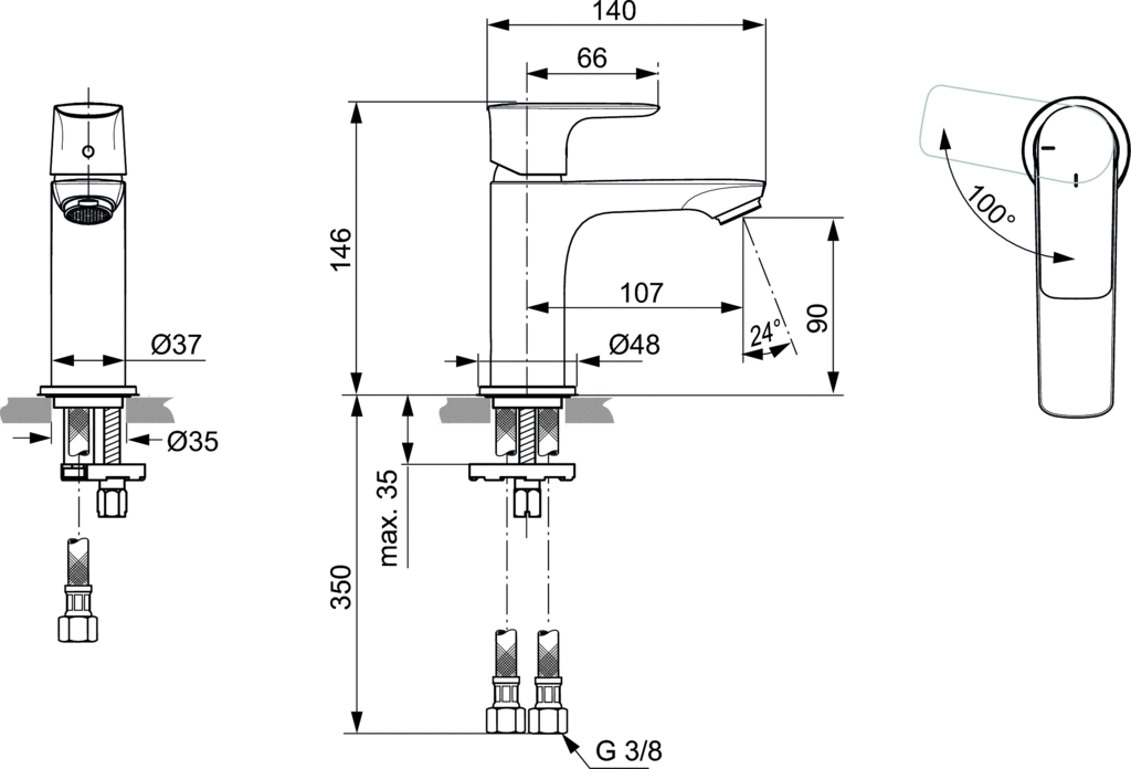 Bateria umywalkowa jednootworowa, smukły metalowy korpus 37 mm, głowica 28 mm. Metalowy automatyczny korek. Aerator typu Perlator M24x1. Metalowy uchwyt z nadrukowanymi czerwonymi i niebieskimi oznaczeniami. Elastyczne wężyki przyłączeniowe PEX G3/8".