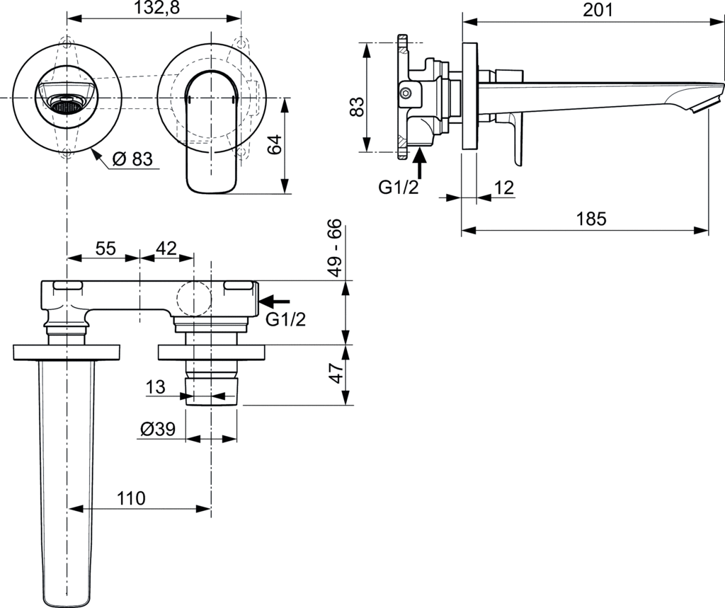 Zestaw montażowy podtynkowej baterii umywalkowej z wylewką 185 mm. Mosiężny, odlewany korpus. Metalowy uchwyt z nadrukowanymi czerwonymi i niebieskimi oznaczeniami oraz metalowy korek automatyczny. Mocowanie uchwytu przedniego, chromowany przycisk. Aerator typu Perlator M24x1 - 5l/min. Głowica 28 mm bez ogranicznika temperatury. Osobne okrągłe rozety dla uchwytu i wylewki, brak funkcji Click. Do skompletowania z zestawem A5948NU (część wewnętrzna).