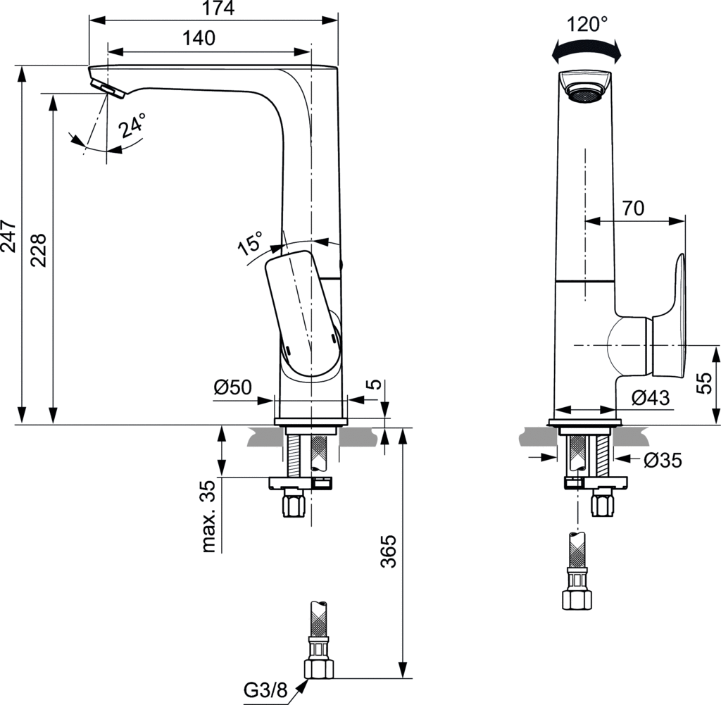 Bateria umywalkowa z wysoką wylewką bez korka automatycznego, smukły metalowy korpus. Metalowy uchwyt z nadrukowanymi czerwonymi i niebieskimi oznaczeniamiObrotowa kwadratowa wylewka 120°. Ruchoma podwyższona wylewka, Aerator typu Perlator M24x1 - 5l/min, głowica 28 mm oraz ogranicznik ciepłej wody - oddzielnie w opakowaniu. Brak funkcji Click. Wężyki przyłączeniowe PEX G3/8".