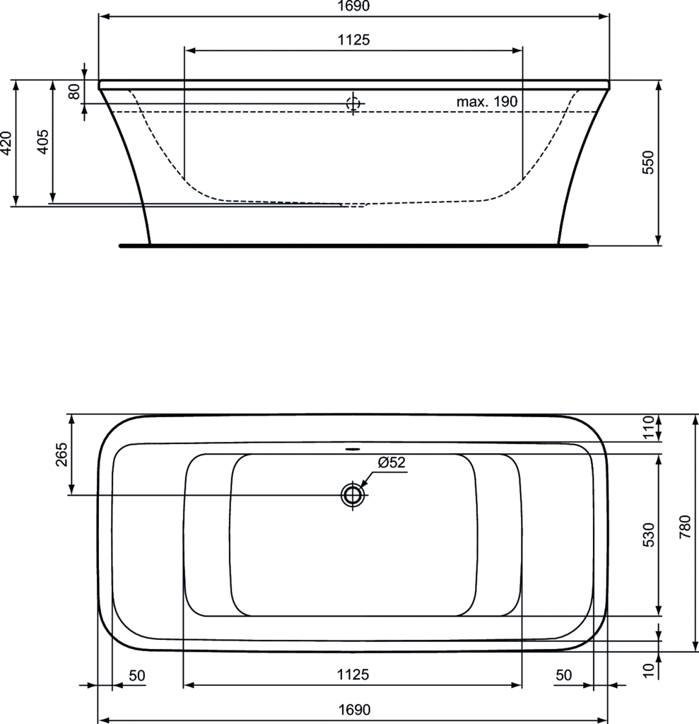 Wanna wykonana z akrylu sanitarnego gr. 5 mm, kolor biały. Bez otworu na baterię. Głębokość do krawędzi 405 mm. Poszerzony rant przeznaczony do montażu baterii stojącej. Pojemność wanny 190 l. EN 14 516. Zalecane dodatkowe elementy: Zestaw odpływowo - przelewowy MULTIPLEX (K7804AA). Zestaw odpływowo - przelewowy MULTIPLEX TRIO z funkcją napełniania wanny przez przelew (K7807AA).