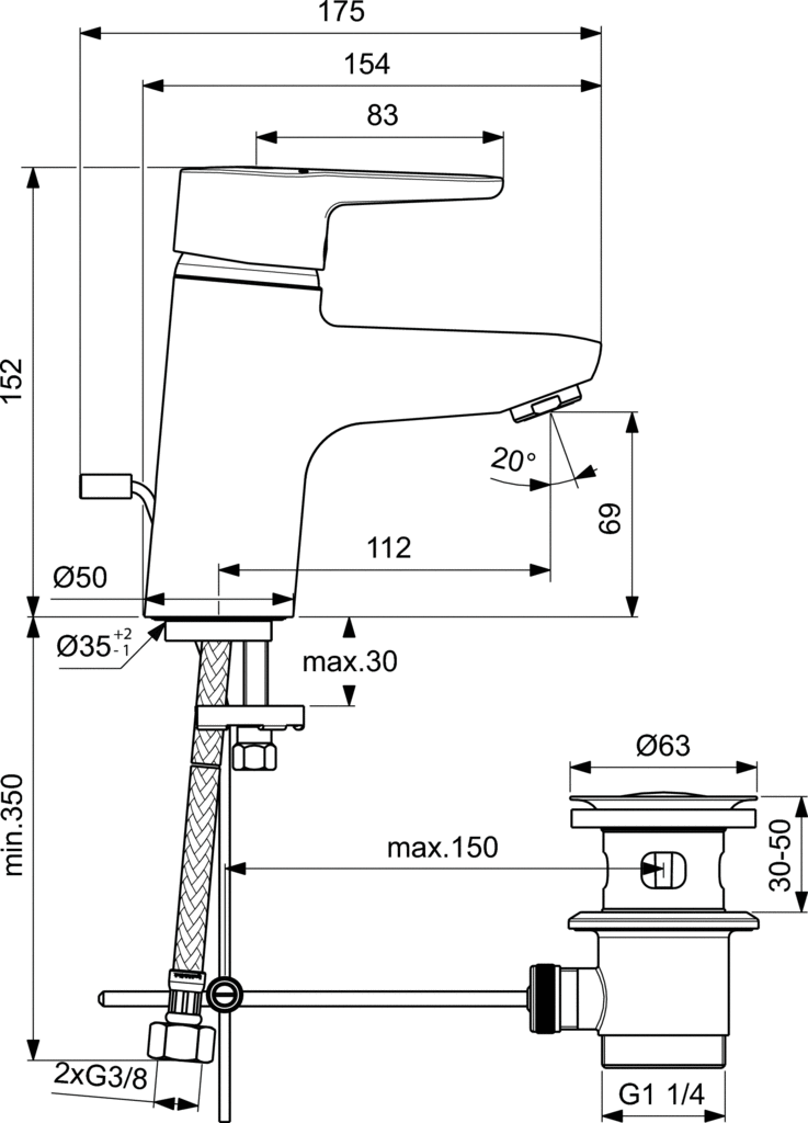 Bateria umywalkowa Connect Blue z korkiem automatycznym. Głowica IS 40 mm CLICK z funkcją ECO i ograniczeniem temperatury wody. Wężyki przyłączeniowe typu PEX G3/8". Aerator typu Cscade z ogranicznikiem przepływu wody do 5 l/min. Metalowy uchwyt z nadrukowanymi czerwonymi i niebieskimi oznaczeniami. Metalowy korek automatyczny.