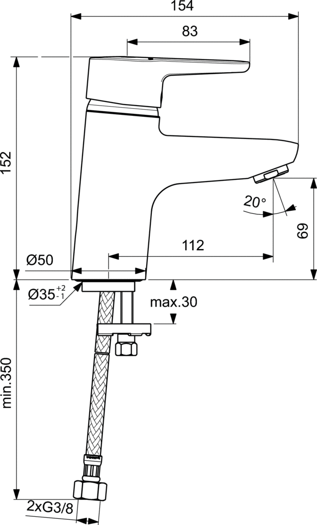 Bateria umywalkowa jednootworowa. Głowica 40 mm CLICK z funkcją ECO i ograniczeniem temperatury wody. Wężyki przyłączeniowe typu PEX G3/8". Areator typu Cascade M24x1. Metalowy uchwyt z nadrukowanymi czerwonymi i niebieskimi oznaczeniami. System montażu EASY-FIX. Metalowy pierścień. Bez korka automatycznego.