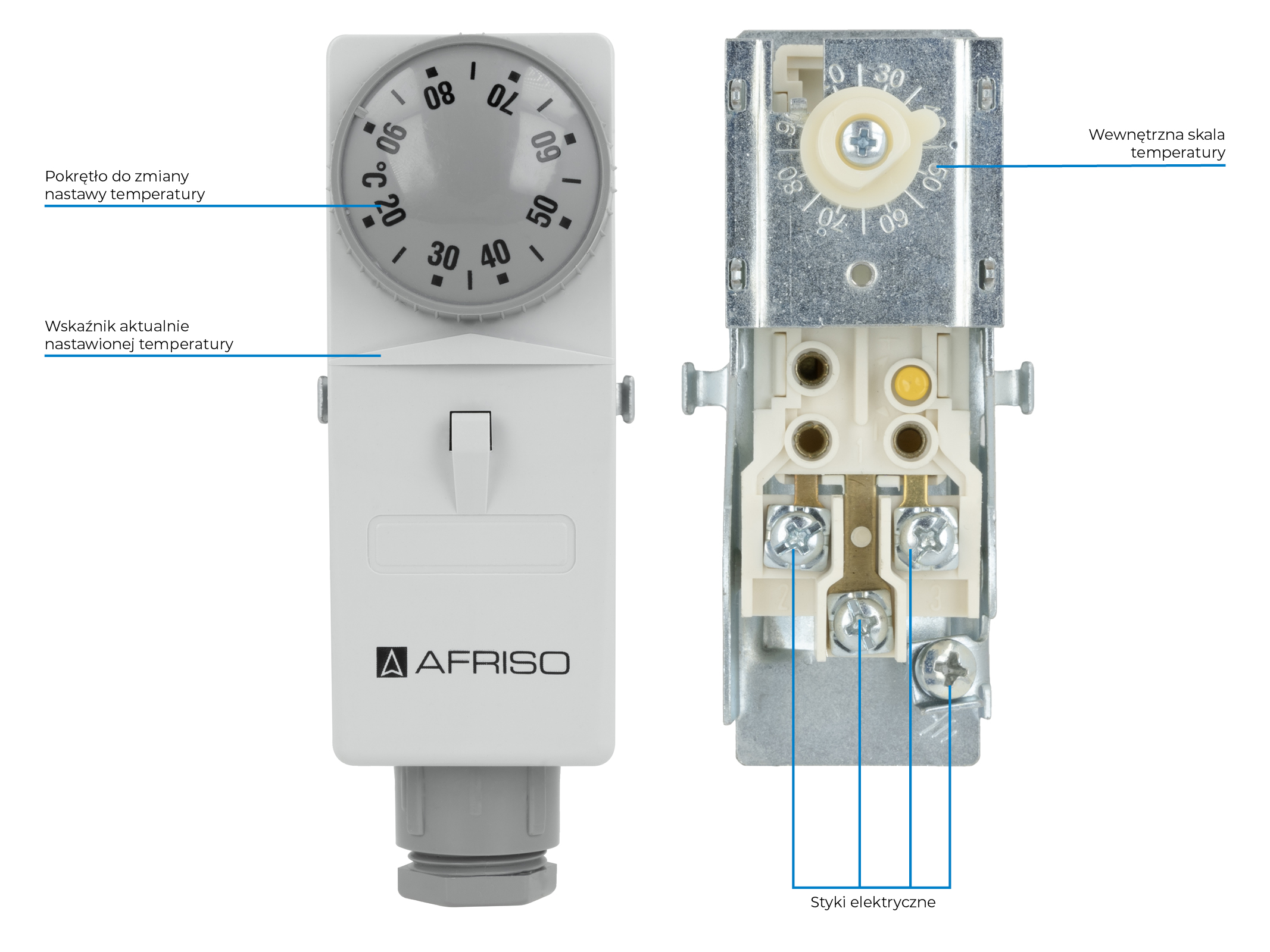 Przeznaczony do sterowania urządzeniami zewnętrznymi, na zasadzie włącz/wyłącz.Włącza lub wyłącza sterowane urządzenie w zależności od temperatury zmierzonej na powierzchni kontaktu i nastawionej na pokrętle.