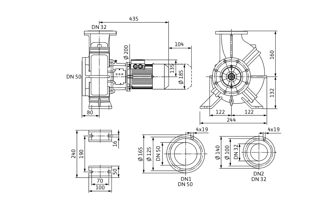 Jednostopniowa dławnicowa pompa wirowa o konstrukcji blokowej do ustawienia na fundamencie wraz ze stopą na korpusie pompy. Odporna na drgania, zapewniająca cichą pracę konstrukcja blokowa z latarnią i sztywno połączonym silnikiem standardowym (silnik znormalizowany). Z wymuszonym opływem, niezależnym od kierunku obrotów mieszkowym uszczelnieniem mechanicznym (od 37 kW/4-bieg. opcjonalnie z kasetowym uszczelnieniem mechanicznym w systemie cofki do wymiany uszczelnienia mechanicznego bez demontażu silnika) oraz wirnikiem redukującym kawitację. Kołnierze z przyłączami pomiarowymi ciśnienia R 1/8. Wszystkie komponenty żeliwa są pokryte powłoką kataforetyczną. W wersji standardowej silniki w klasie IE3. Pompy z silnikami ≥ 5,5 kW są seryjnie wyposażone w czujnik termistorowy jako zabezpieczenie silnika. Dane eksploatacyjne Przetłaczane medium: Dane w zależności od typu Przepływ: Dane w zależności od typu Wysokość podnoszenia: Dane w zależności od typu Temperatur