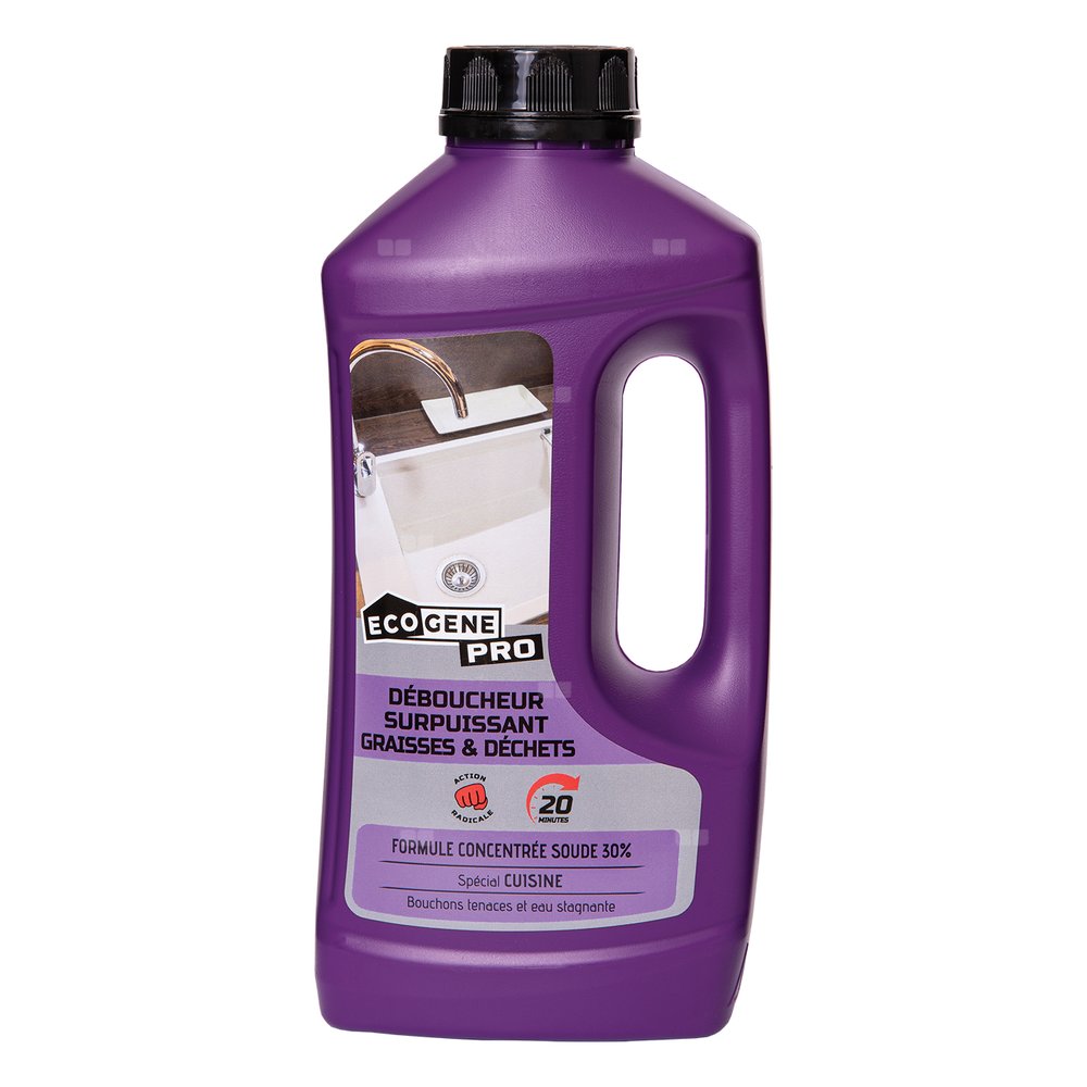 Dzięki skoncentrowanej formule zawierającej 30% sody, silny środek do udrożniania rur ECOGENE PRO radykalnie usuwa nagromadzony tłuszcz, resztki jedzenia i osady mydlane odpowiedzialne za zatykanie zlewu. Jest specjalnie opracowany, aby zwalczać uporczywe zatory i działać głęboko, nawet w przypadku stojącej wody w rurach kuchennych.