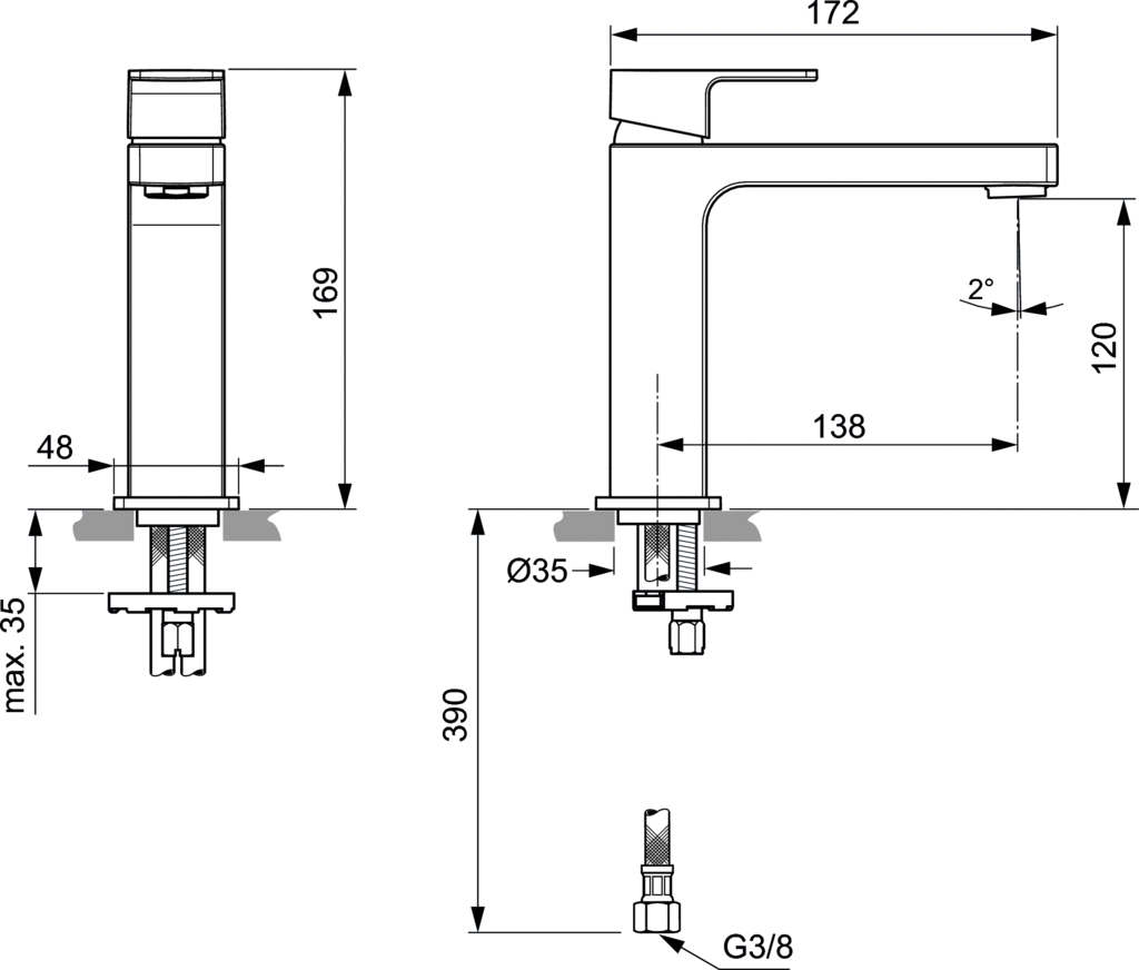 Bateria umywalkowa bez metalowego korka automatycznego. Głowica ceramiczna IS 28 mm. Metalowy uchwyt z logo Ideal Standard oraz nadrukowanymi czerwonymi i niebieskimi oznaczeniami. Aerator typu Perlator M24x1 - z ogranicznikiem przepływu wody do 5l/min. Metalowy pierścień uszczelniający. Klasa akustyczna 1. Wężyki przyłączeniowe PEX G3/8". System montażu EASY-FIX. Zgodna z EN817.