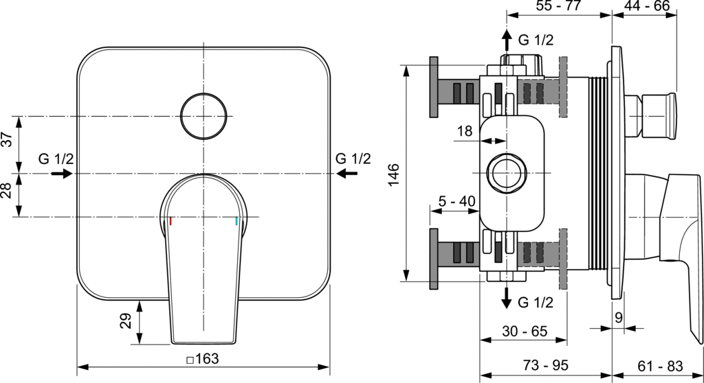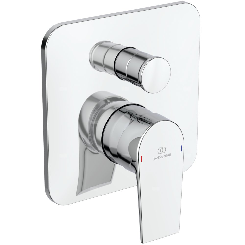 Zestaw montażowy podtynkowej baterii wannowo-natryskowej. Głowica IS 47 mm CLICK. Automatyczny przełącznik. Metalowy uchwyt z logo Ideal Standard oraz nadrukowanymi czerwonymi i niebieskimi oznaczeniami. Chromowana metalowa rozeta. Klasa akustyczna 1. Zgodna z EN817. Do skompletowania z zestawem A1000NU (część wewnętrzna).
