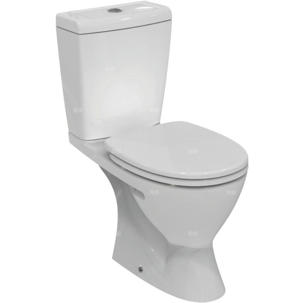 Kompakt WC Eurovit+ ścisle mocowany stojący - lejowy, z poziomym odpływem, zbiornik o pojemności 3/6 l z dolnym dopływem i deską sedesową z duroplastu z pokrywą i metalowymi zawiasami. Zestaw montażowy w komplecie (WW965413).