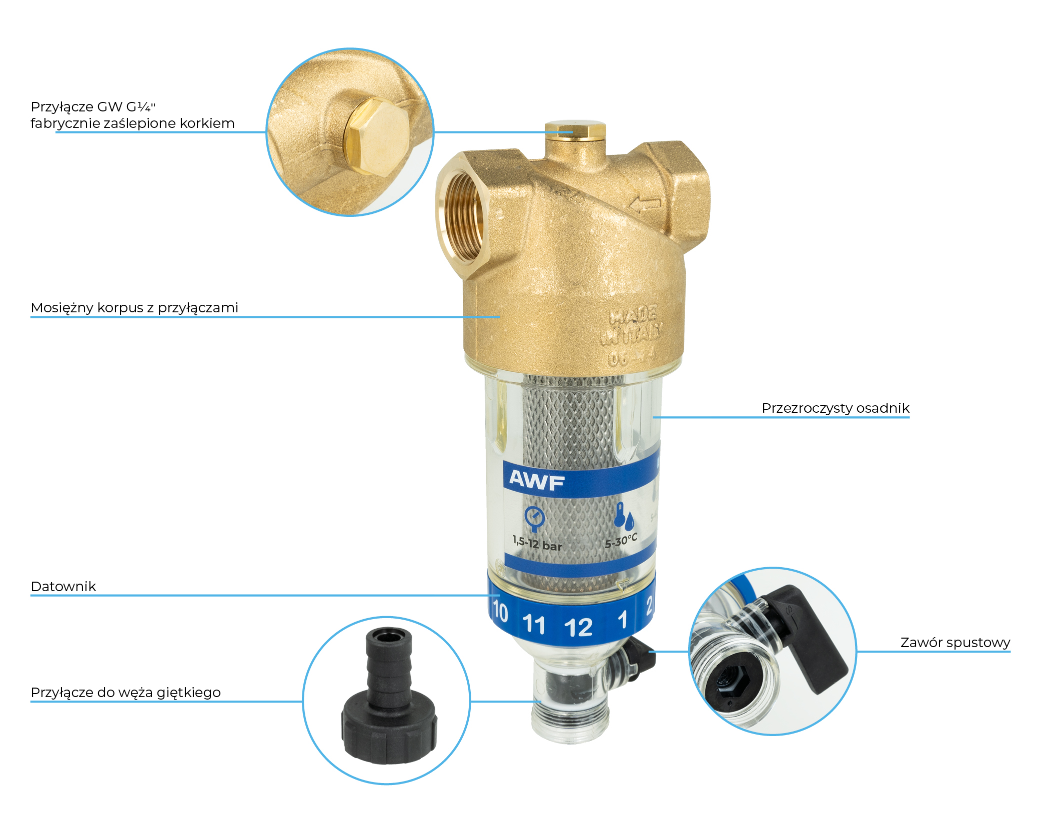 Korek G1/4" można zastąpić manometrem, w celu kontroli ciśnienia na wlocie do filtra.