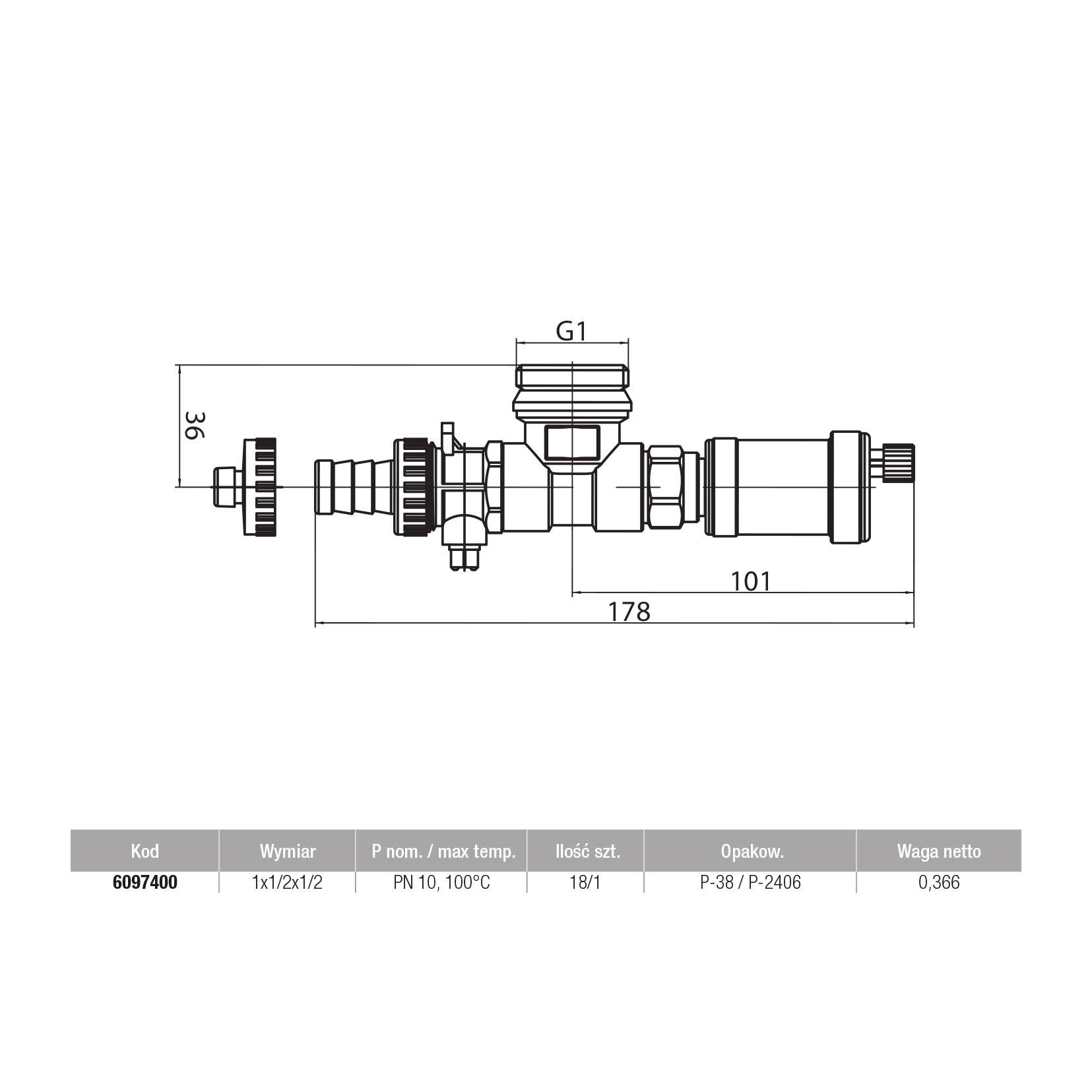 - Grupa bezpieczeństwa do rozdzielaczy c.o. składająca się z: trójnika redukcyjnego G1xG1/2, automatycznego zaworu odpowietrzajacego G1/2 i zaworu spustowego G1/2