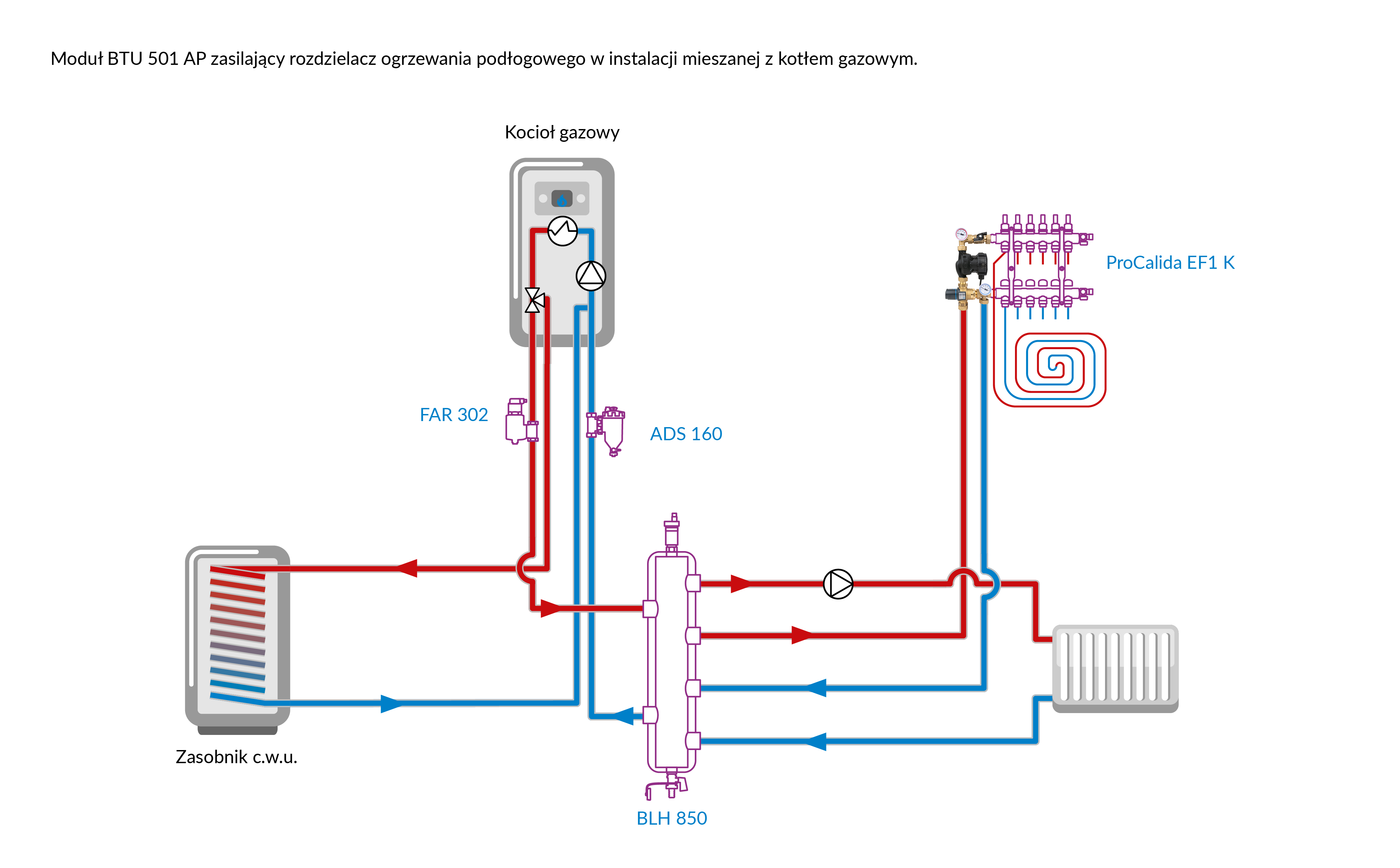 Stosowany w instalacjach grzewczych.Montowany między źródłem ciepła a rozdzielaczem ogrzewania płaszczyznowego w szafce rozdzielacza.