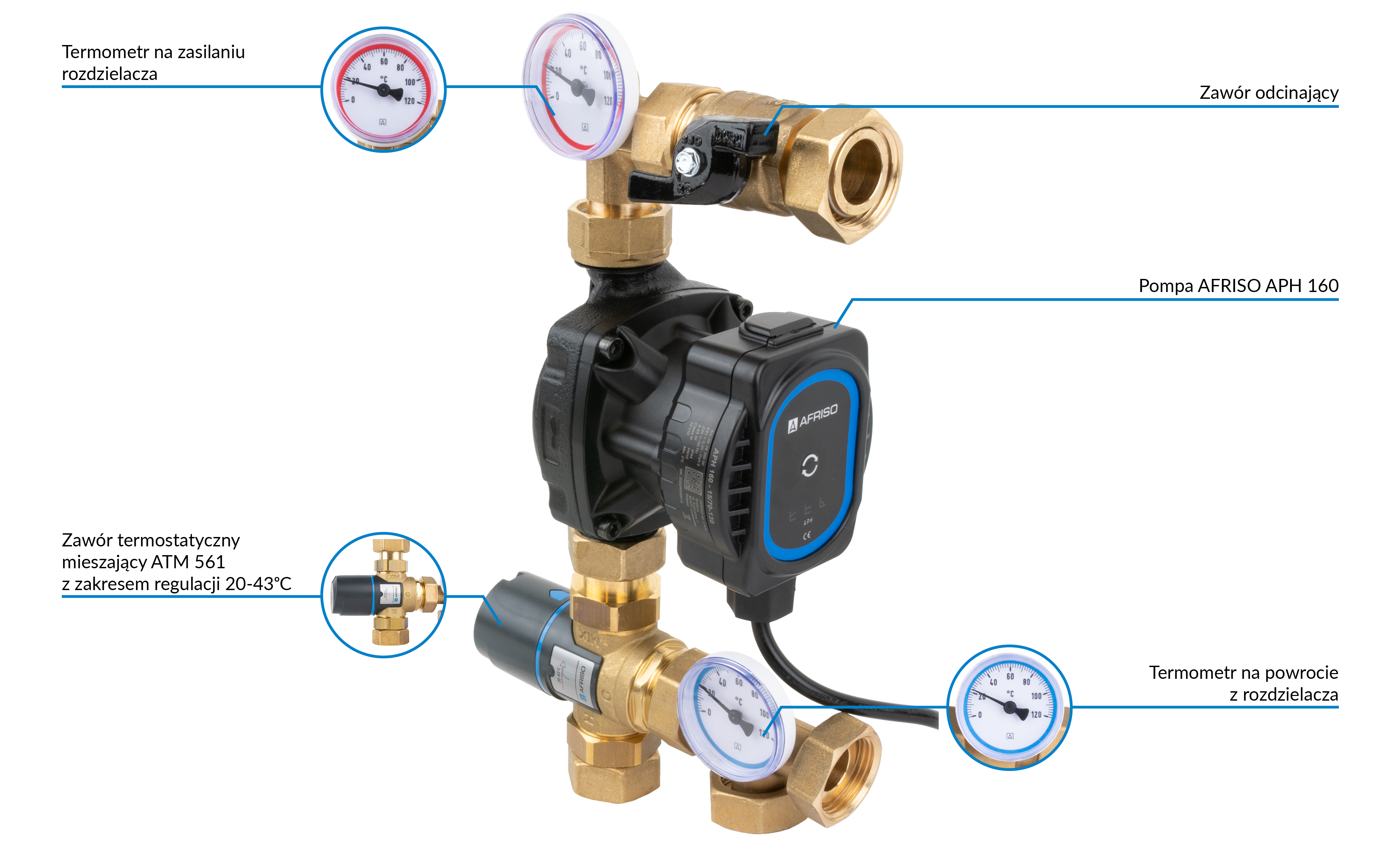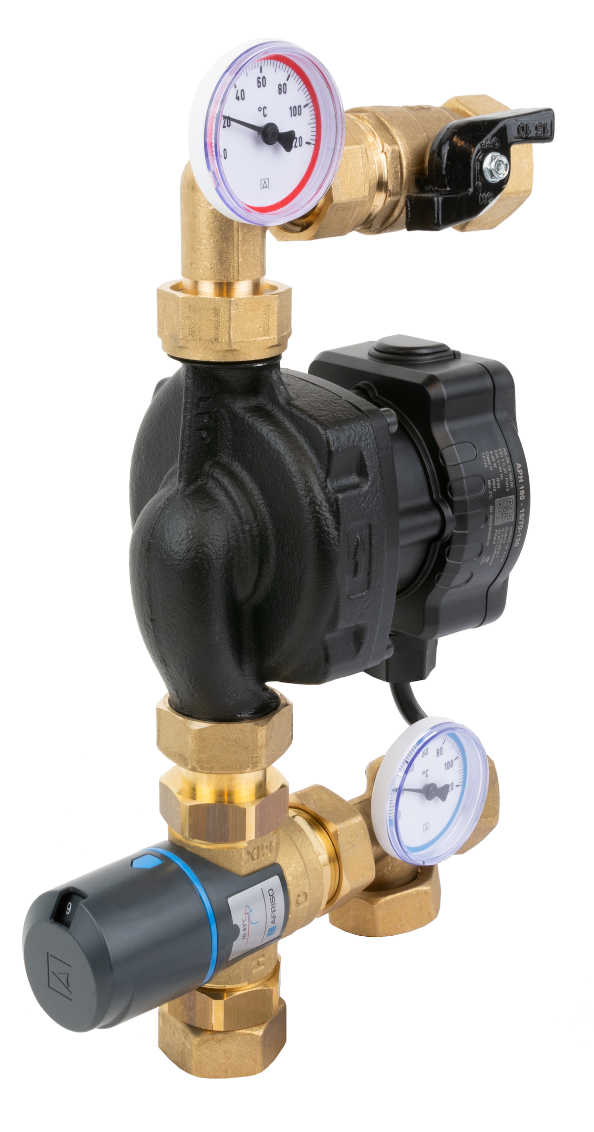 Grupa pompowa AFRISO BTU 501 AP nakrętka x nakrętka 1'' x 1'', z zaworem termostatycznym, z pompą obiegową AFRISO APH 160 15-7/130 mm
