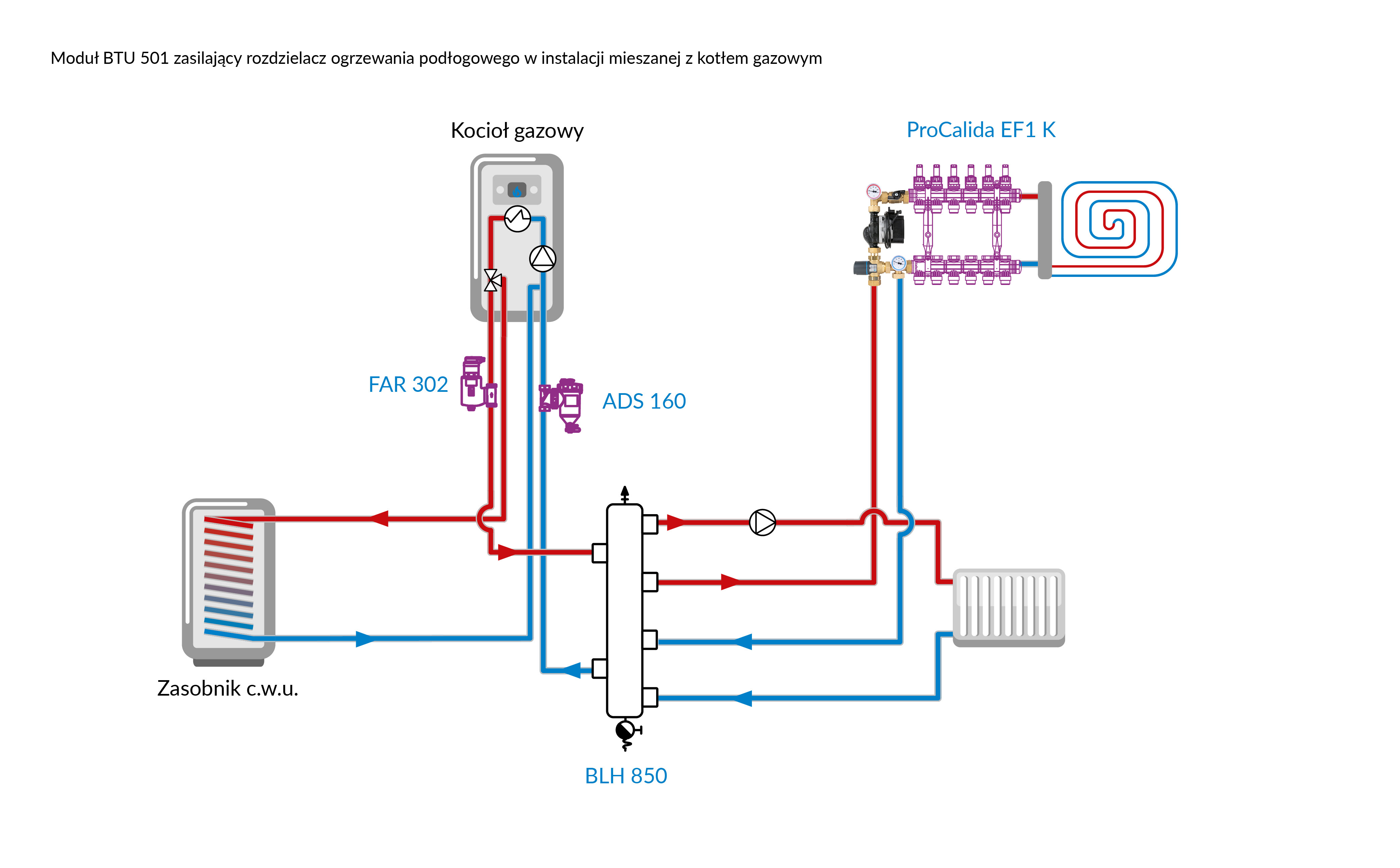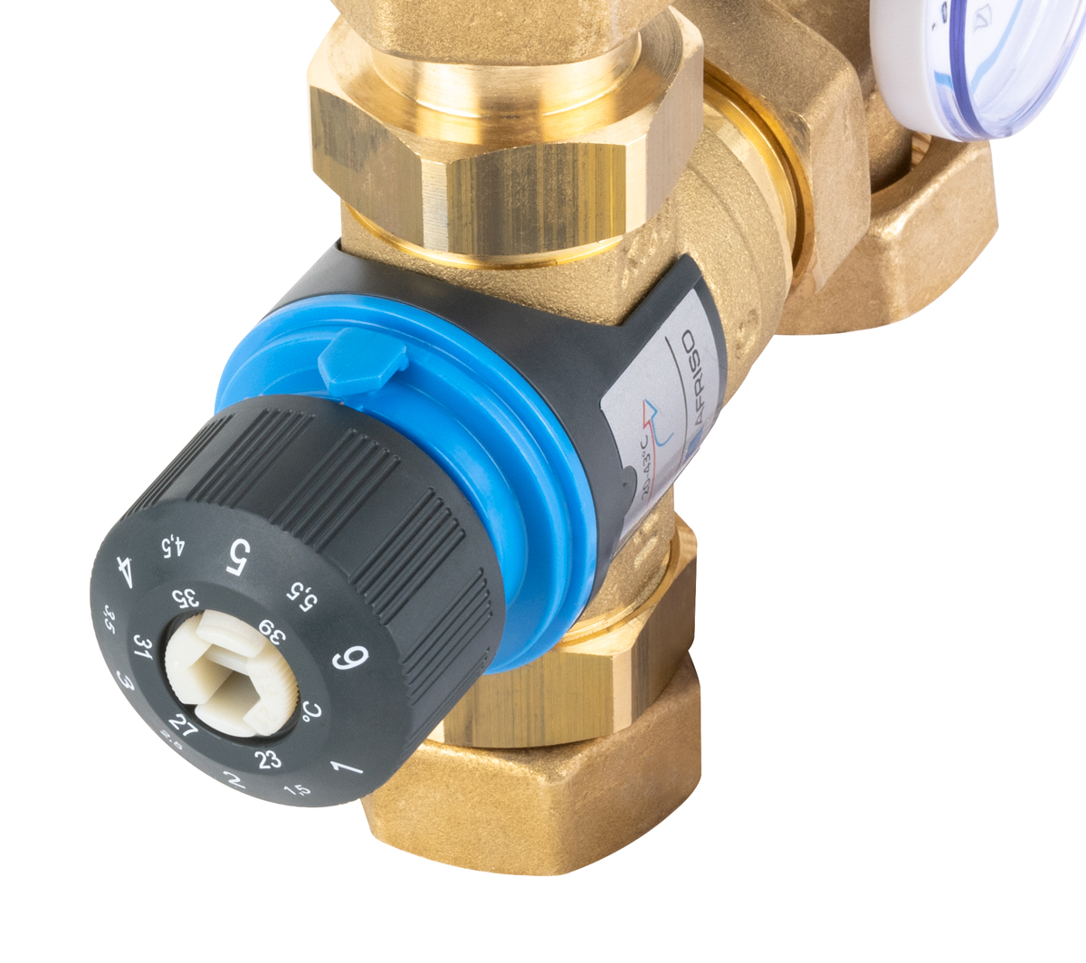 Stosowany w instalacjach grzewczych.Montowany między źródłem ciepła a rozdzielaczem ogrzewania płaszczyznowego w szafce rozdzielacza.