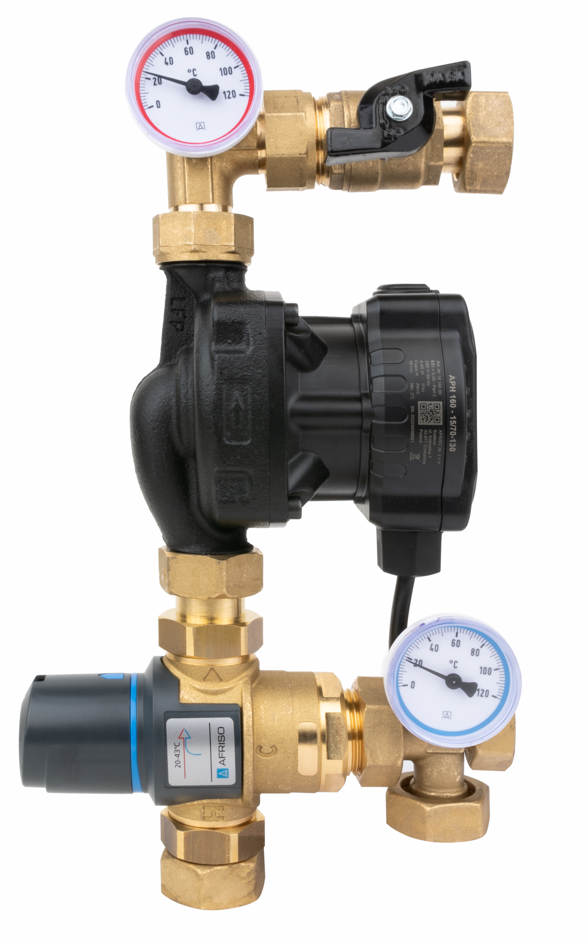 Grupa pompowa AFRISO BTU 502 AP nakrętka x nakrętka 1'' x 1'', z zaworem termostatycznym, z pompą obiegową AFRISO APH 160 15-7/130 mm