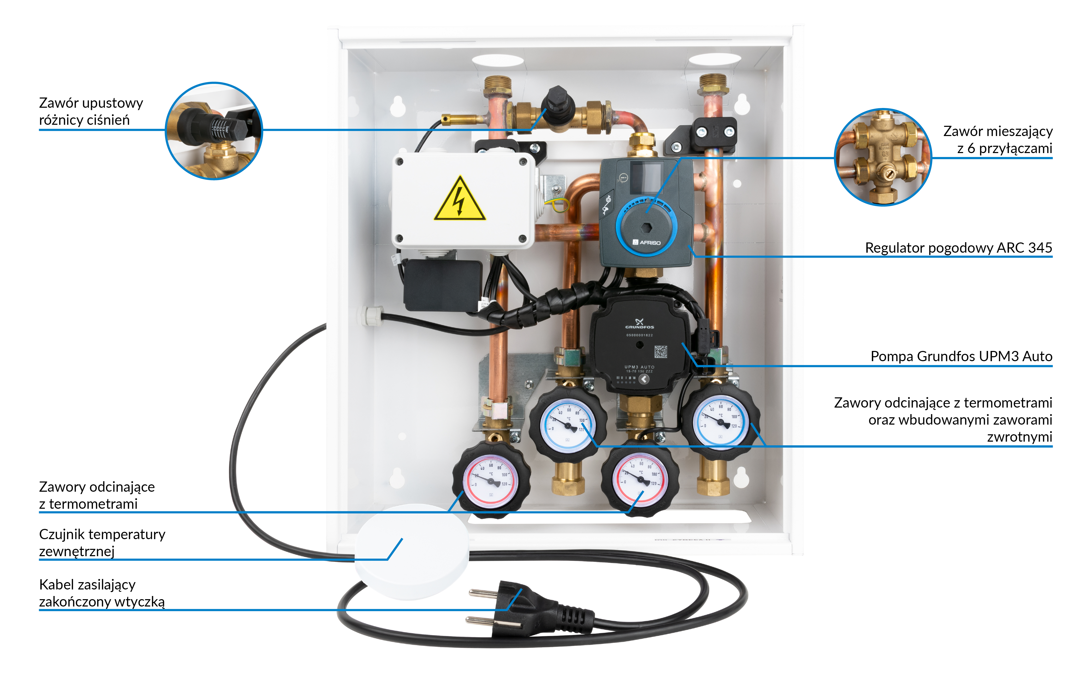 Zawór mieszający oraz pompa obiegowa sterowane są regulatorem pogodowym ARC 345 ProClick, który reguluje temperaturę na podstawie temperatury zewnętrznej i ustawionej krzywej grzewczej.
