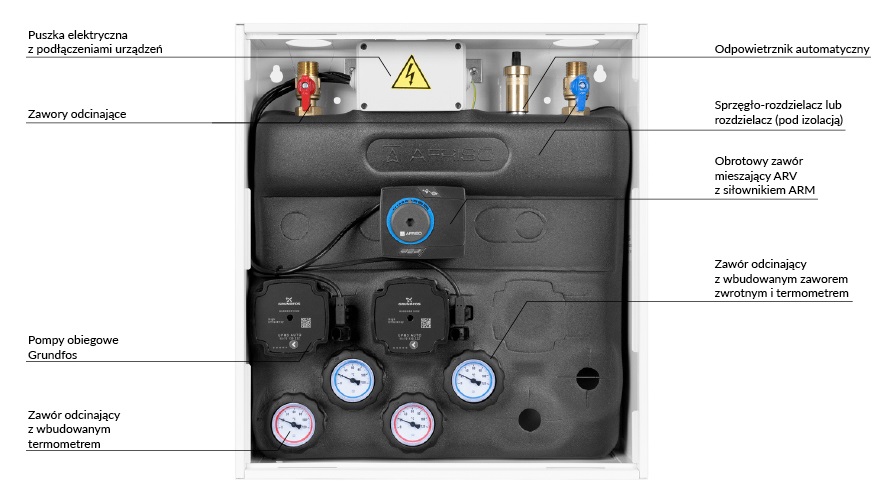 - Wyposażony w pompy Grundfos UPM3 i obrotowy zawór mieszający z siłownikiem ARM 141 ProClick.